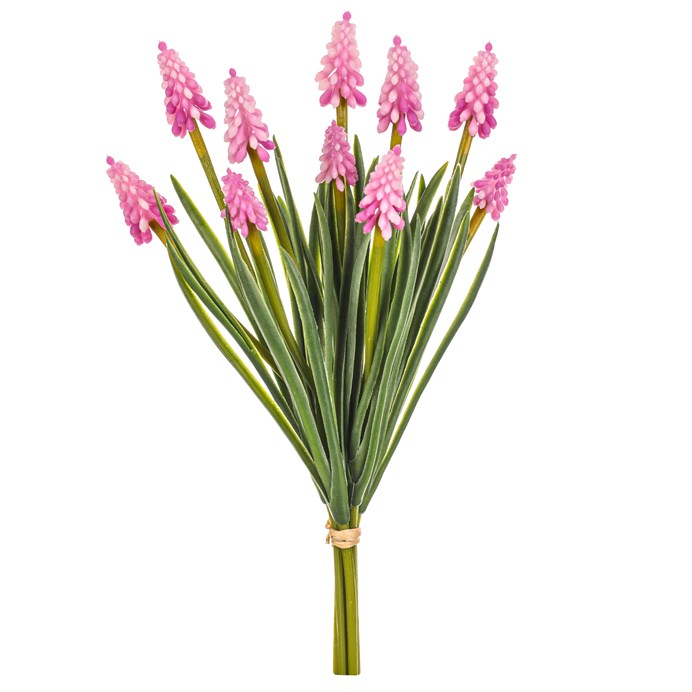 Dotaz na produktUmělá kytice modřence v růžovém odstínu obsahuje pět jednotlivých stonků spojených do svazku. Plastové květy věrně napodobují přirozený tvar a barevnost modřenců, zatímco zelené listy doplňují celkový vzhled. Svazek je vhodný pro dekoraci interiérů, kde přináší svěží a barevný akcent bez nutnosti péče. Díky plastovému materiálu je snadno udržovatelný a dlouhodobě zachovává svůj vzhled. Ideální pro aranžmá v květináčích, vázách nebo jako součást větších dekorací.
