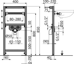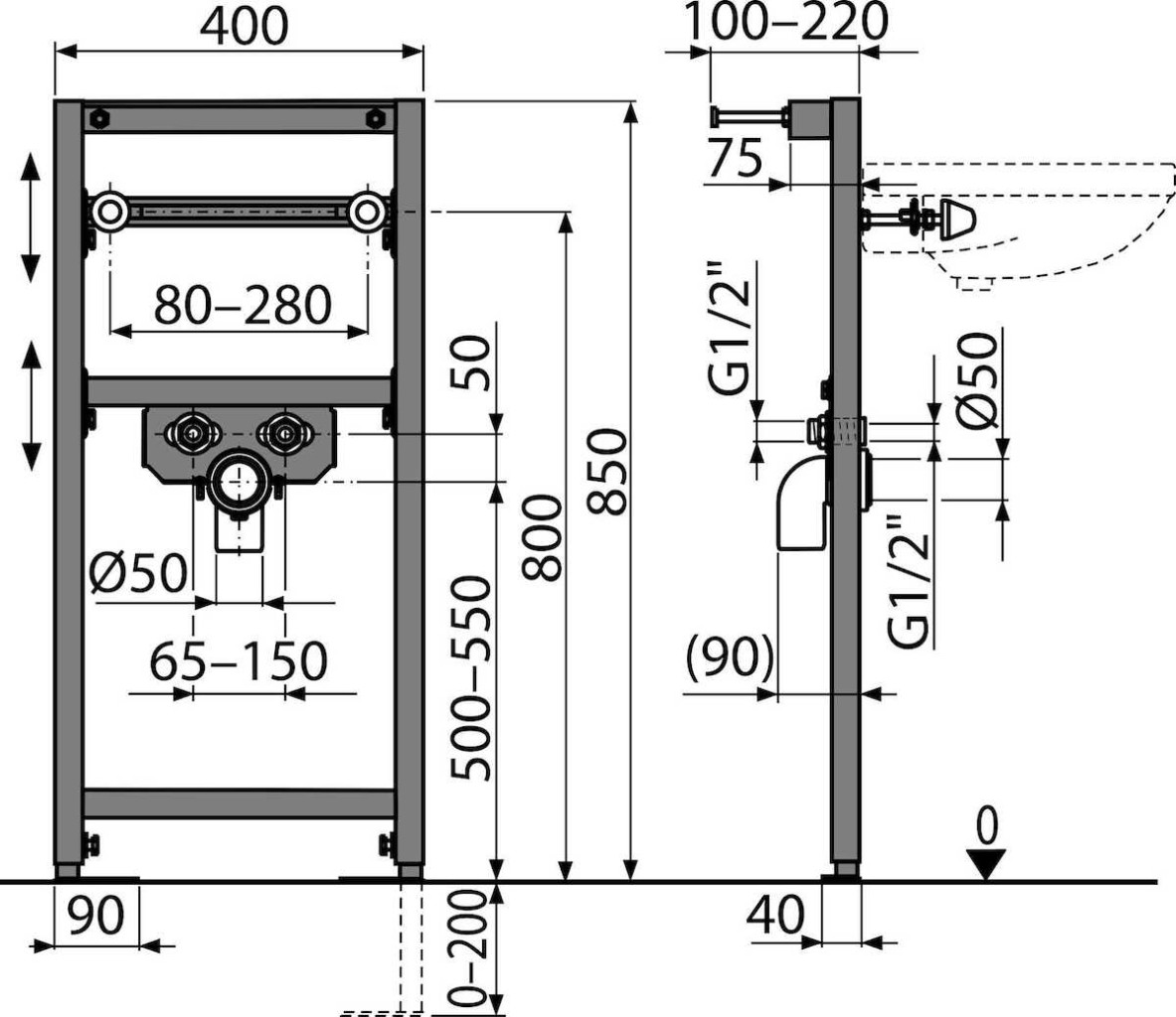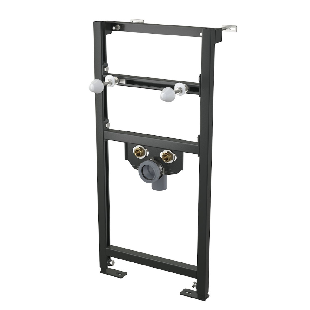 Samonosný rám s C-profilem; Výškově stavitelné příčky; Nastavitelné výsuvné nohy v rozmezí 0–200 mm; Rozteč upevnění umyvadla 80–280 mm; Rozteč přívodu vody 65–150 mm; Materiál: kov ošetřený práškovou barvou