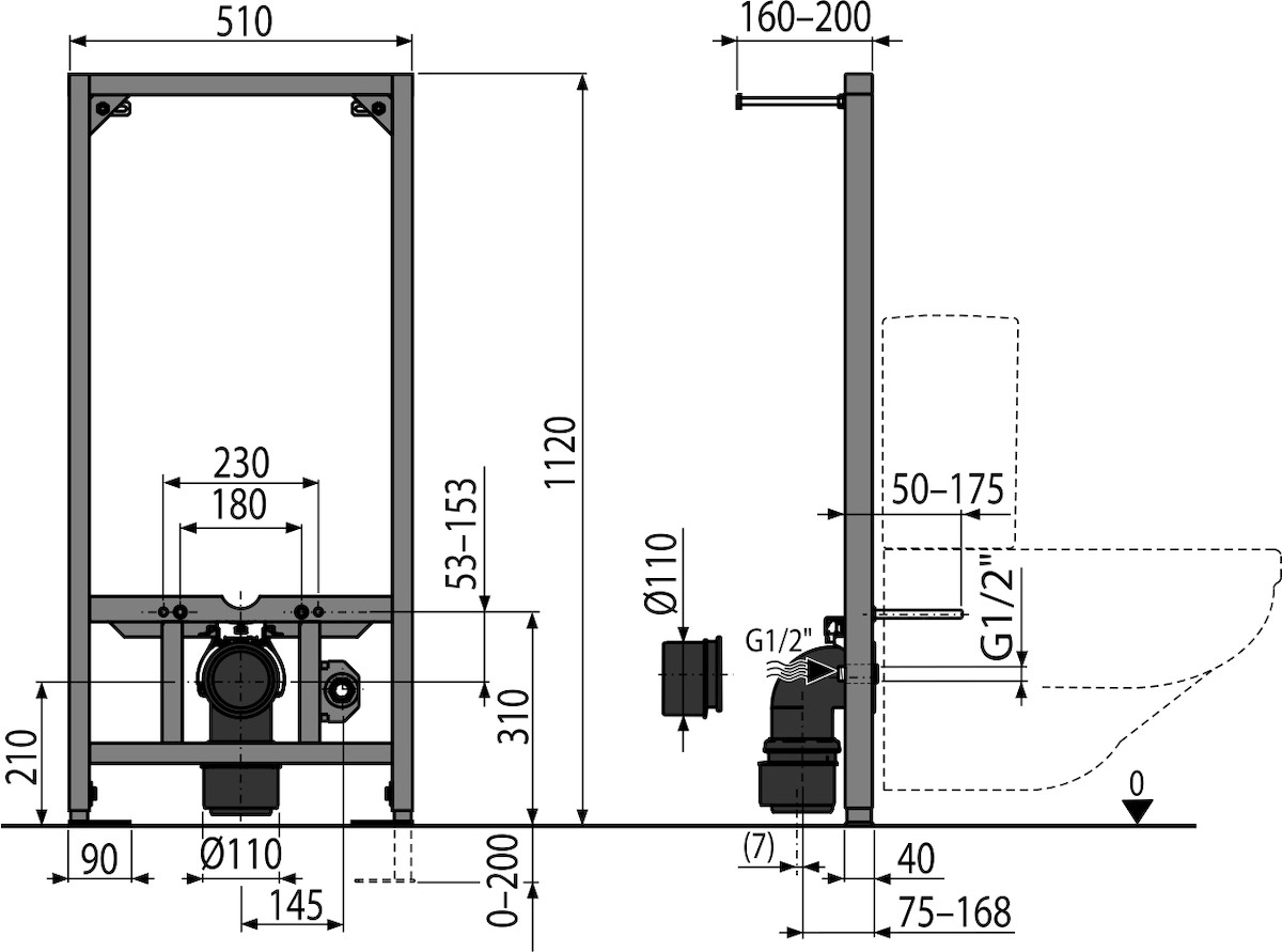 Konstrukce rámu dovoluje kotvení k samostatné dostatečně nosné sádrokartonové příčce nebo před nosnou stěnu; Nastavitelné výsuvné nohy v rozmezí 0–200 mm; Příprava pro napojení vody; Příprava na připojení držáku s DG1/2" přechodem pro bidetovací sedátka a spršky; Materiál: kov ošetřený práškovou barvou