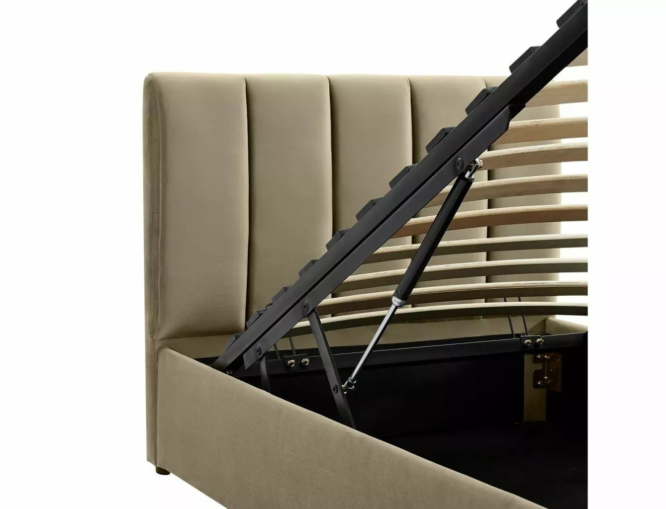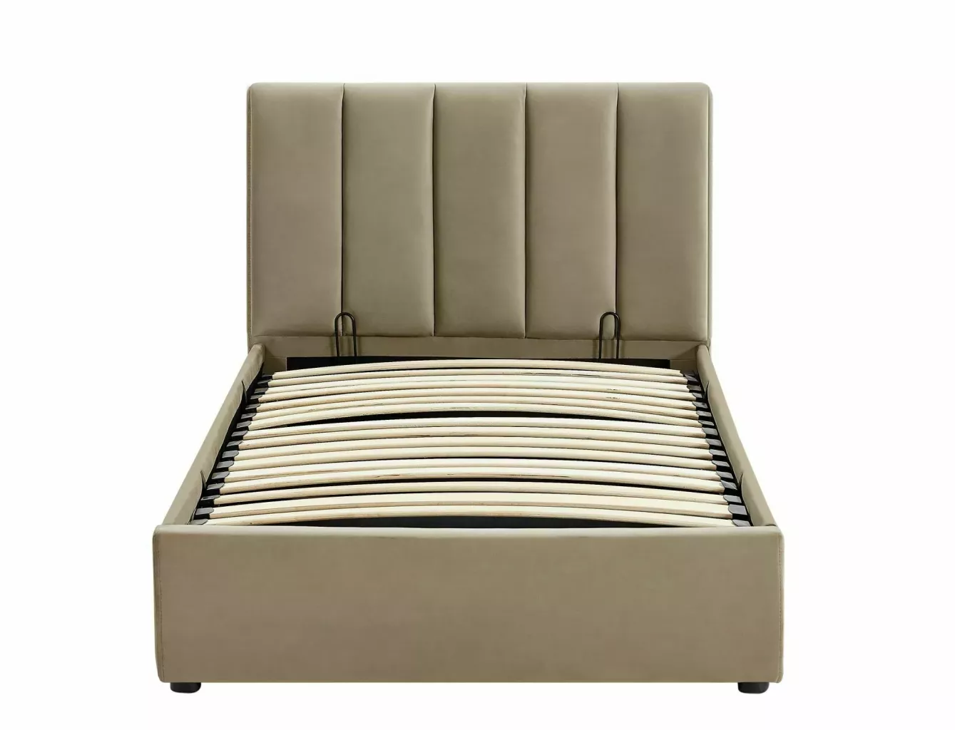 Dotaz na produkt Na splátky ještě dnesPostel s úložným prostorem, sametová látka Bluvel, barva: 28 béžová. Součástí je rám z ohnutých lamel upevněných v flexibilních držácích. Plynové pružiny. Rozměr matrace 90x200cm (cena bez matrace).