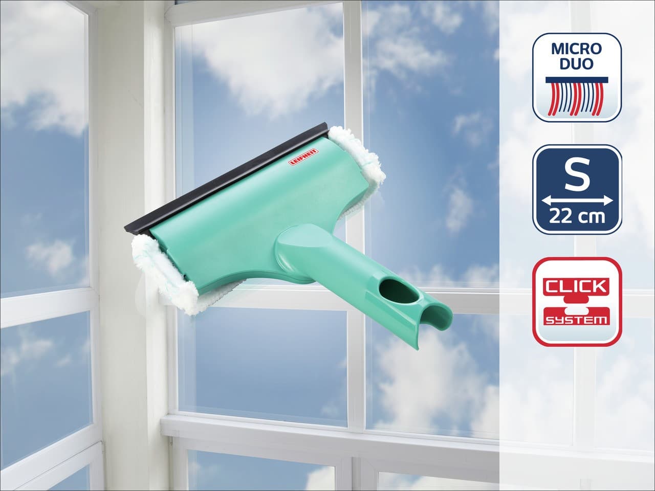 PARAMETRY:Balení: 1 ksDruh výrobku: mop na okna Materiál: guma/plast/mikrovlákno Barva popisná: tyrkysová Barva základní: modrá Šířka: 19  cmVýška: 5  cmZnačka: Leifheit Záruční lhůta: 2 roky
