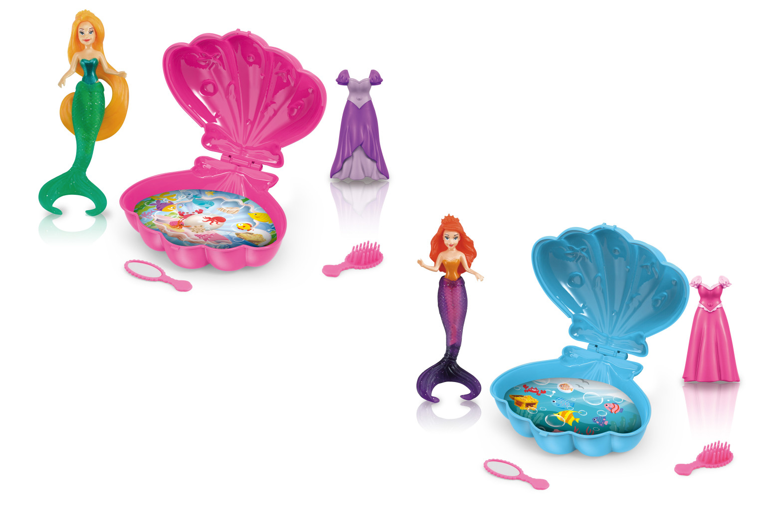 Dotaz na produktMořská víla s mušlí. Velikost 9,5 cm. Součástí víla, mušle, šaty, zrcátko, hřeben. 3 barevné varianty mušle - žlutá, modrá, fialová.