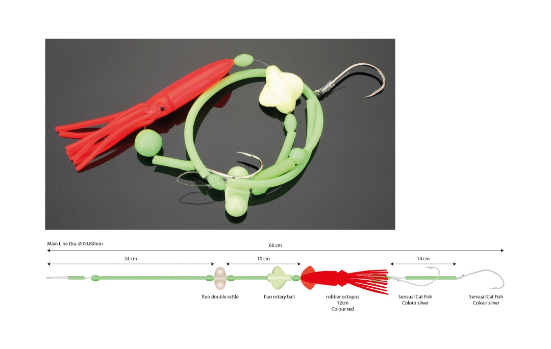 Dotaz na produktMontáž se dvěma háčky a umělým kalamárem, osazená rotační rolničkou a extra ostrými háčky, ideální pro lov na hloubkách 50 - 300 m. Použijte celé živé nebo mrtvé ryby. Vhodné pro mníky, tresky a halibuty.