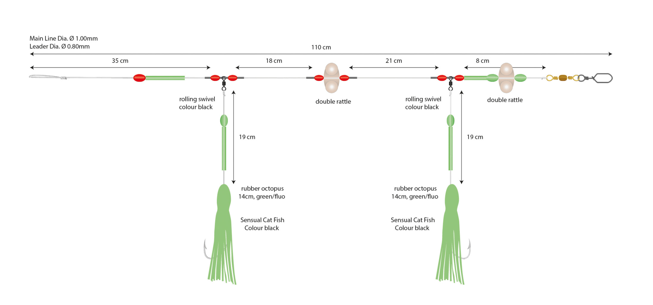 Dotaz na produktMontáž pro lov norského vlkouše (kočky) s fluorescentní chobotnicí a rolničkou pro snadné nalezení nástrahy. Vhodná pro filety a lov s velkou zátěží na hloubkách 50-100 m. Ideální pro "kočky" a velké mníky.