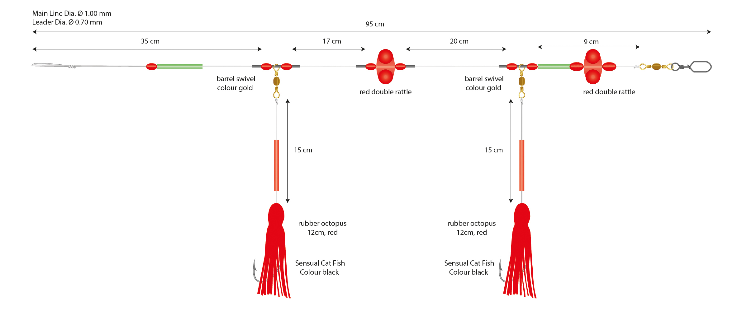 Dotaz na produktMontáž konstruovaná s důrazem na každý detail - jeho jednotlivé součásti, rolničky a červené chobotnice účinně vábí vlkouše a provokují je k útoku. Montáž je nejúčinnější na hloubkách o 5 - 50 m.