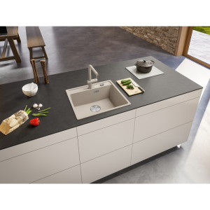 Fragranitový dřez Maris. Cena zahrnuje: Vymezovací podložku pro montáž kuchyňské baterie. Sítkový ventil 3 1/2“ s přepadem a nerezovou krytkou ventilu. Sifon pro úsporu místa 6/4“ s odbočkou na myčku...