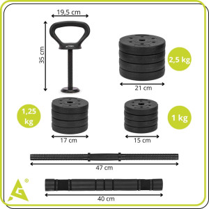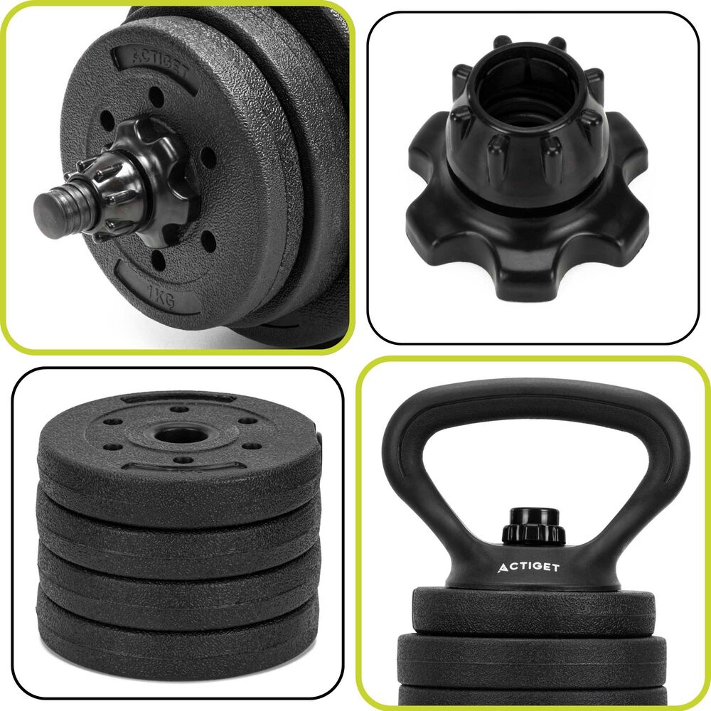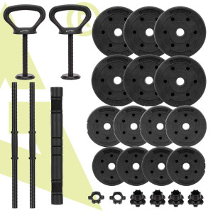 Konstrukce setu je navržena pro pravidelné zatížení a dlouhodobé používání. Materiály jsou odolné proti opotřebení a vhodné pro domácí i klubové prostředí. Celková hmotnost 30 kg poskytuje dostatečný rozsah pro začátečníky i pokročilé. Díky chytrému systému sestavení je set skladný a ideální i do menších prostor.