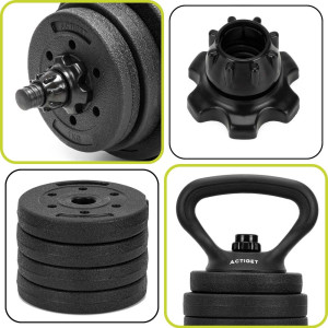 Multifunkční činkový set 30 kg ACTIGET ACT0046 je ideálním řešením pro každého, kdo chce mít doma univerzální vybavení na kompletní silový trénink. Díky systému 4v1 umožňuje sestavení jako jednoruční činky, obouruční činku, vzpěračskou činku nebo nastavitelné kettlebelly. V jednom setu tak získáte řešení pro desítky cviků na celé tělo bez nutnosti dokupovat další vybavení.