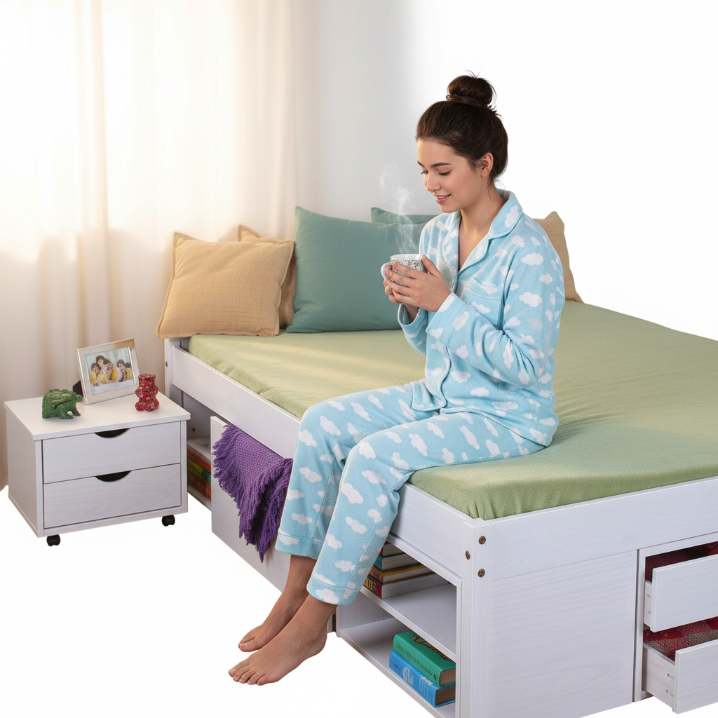 Postel je vyrobena z kvalitního nábytkového materiálu (běžně lamino/LTD, případně MDF dle konkrétní série), který je vhodný pro každodenní používání. Povrch je praktický na údržbu – stačí měkký hadřík (suchý nebo lehce vlhký) a máte hotovo.