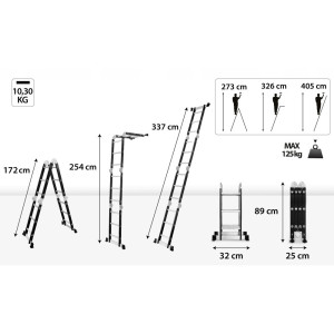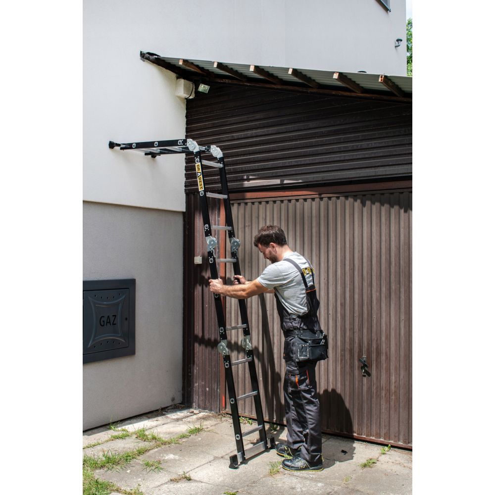 Kompaktní, pevný a univerzální kloubový žebřík, který lze sestavit v 7 různých kombinacích. 4x3 příčky, výška plošiny 0,85 m, max. pracovní výška 4,05 m, nosnost 125 kg. Snadno přenosný a zcela multifunkční žebřík pro práci ve výškách. Vhodný pro každodenní domácí použití, kolem domu nebo na zahradě.