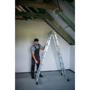 Nezáleží na tom, jestli jste profesionál nebo kutil, tento žebřík bude zcela jistě nepostradatelným pomocníkem při jakékoliv práci. Díky pohyblivým kloubům ho můžete sestavit v 7 různých kombinacích.