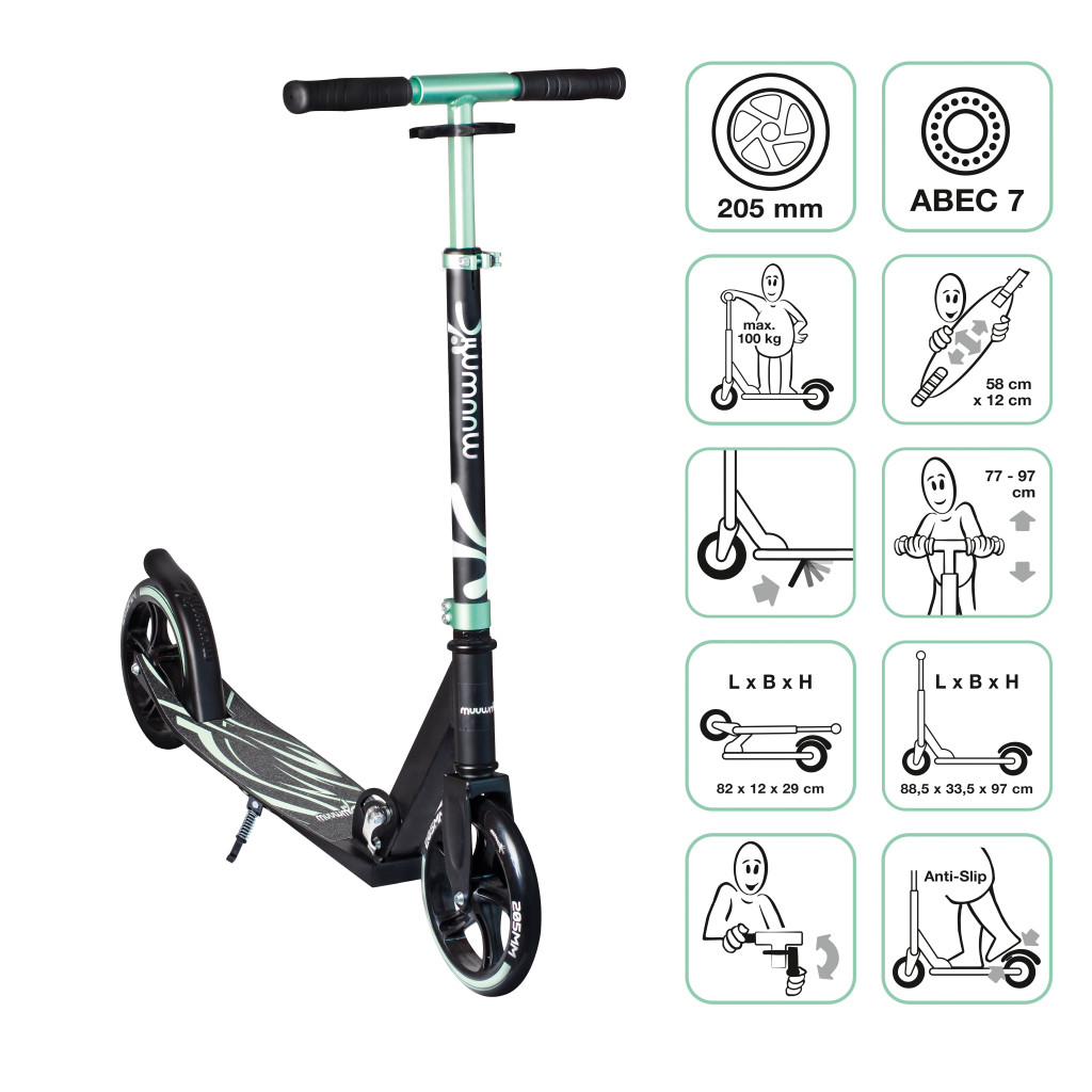 • Stylový design: S touto koloběžkou v mátovo černé barvě zazáříte.
