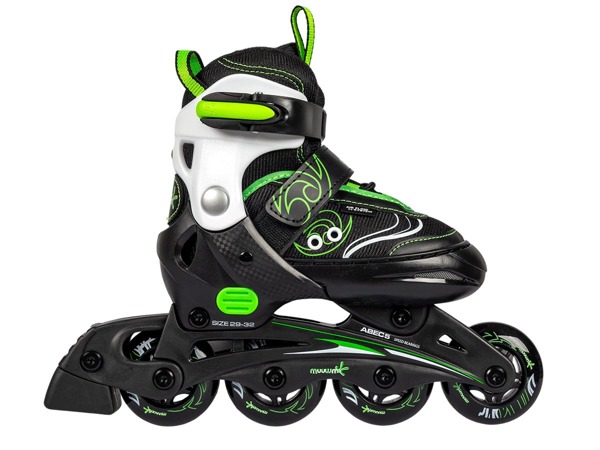 Užijte si hodiny zábavy a pohybu s těmito stylovými zelenými inline bruslemi Muuwmi, které jsou ideální pro malé bruslaře. Díky nastavitelným velikostem brusle porostou s vaším dítětem, takže se z nich bude moci těšit dlouhé roky.