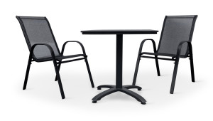 Balkonový stůl doplňují odolné stohovatelné židle s ocelovou konstrukcí a vzdušnou textilií. Vzdušná textilie, ze které je vyroben sedák, je ideální na léto a díky inteligentnímu tvarování velice pohodlná. Židle lze jednoduše naskládat na sebe a nezaberou vám mnoho místa při uložení. Vhodná pro nekomerční použití. Pro delší životnost neskladovat židle ve vlhkých prostorách a nenechávat na dešti.