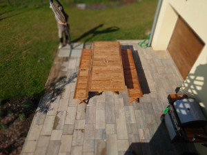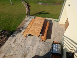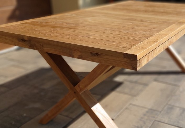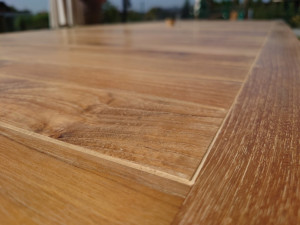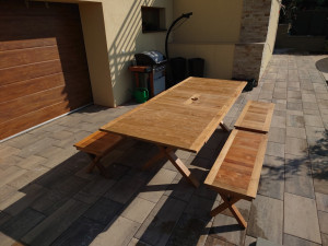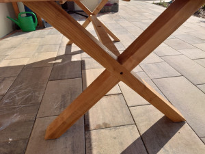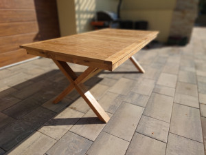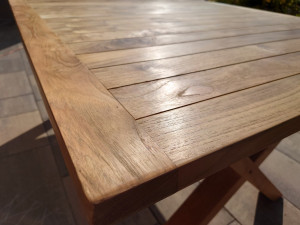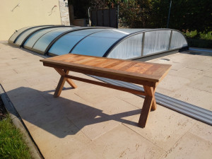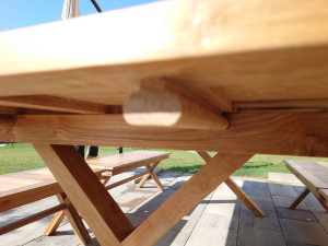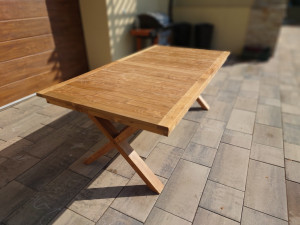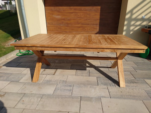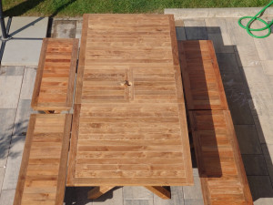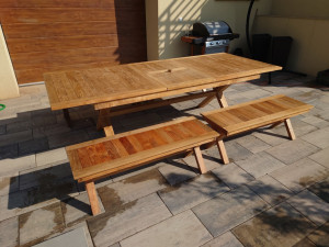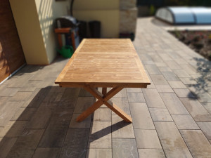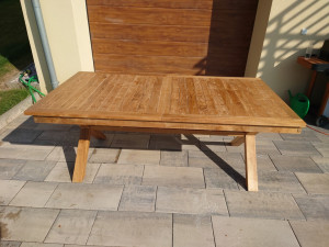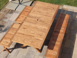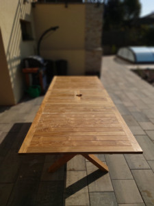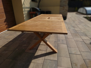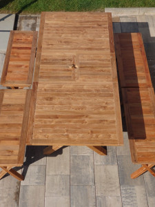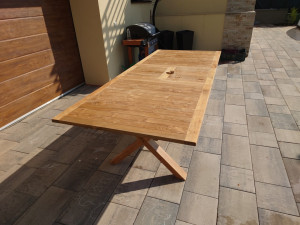 Sestava zahrnuje masivní rozkládací stůl z toho nejkvalitnějšího teakového dřeva. V rozloženém stavu stůl nabídne pohodlné stolování pro 8-10 osob. Rozložením stůl prodloužíte až na délku 260 cm. Jedná se jednoznačně o největší teakový stůl v naší nabídce. Uprostřed obdélníkové desky stolu se nachází otvor pro slunečník. Stůl dodáváme včetně dřevěné záslepky pro případ, kdy slunečník nebudete používat.