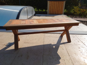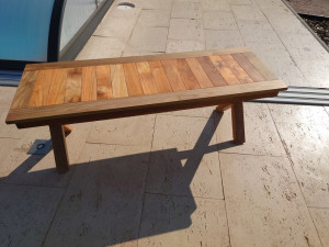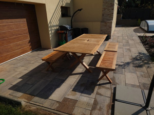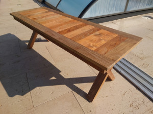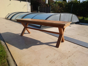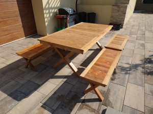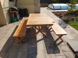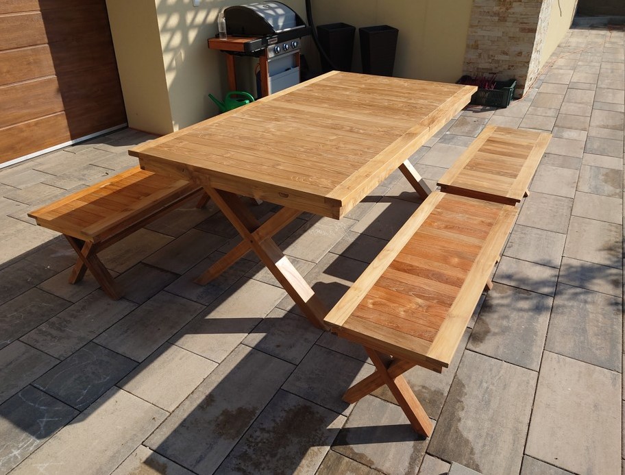 Zahradní jídelní stůl doplňují 4 masivní teakové lavice CUBA. Každá z lavic poskytne pohodlně 2 místa k sezení. Design lavice navazuje na vzhled jídelního stolu. Sedák lavice na robustních překřížených nohou na obou stranách.