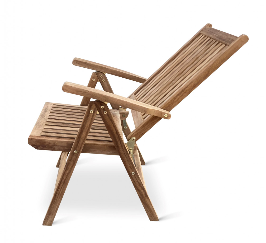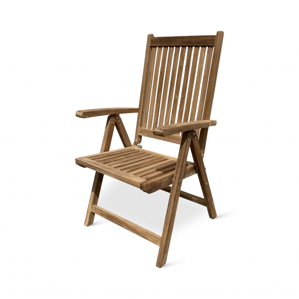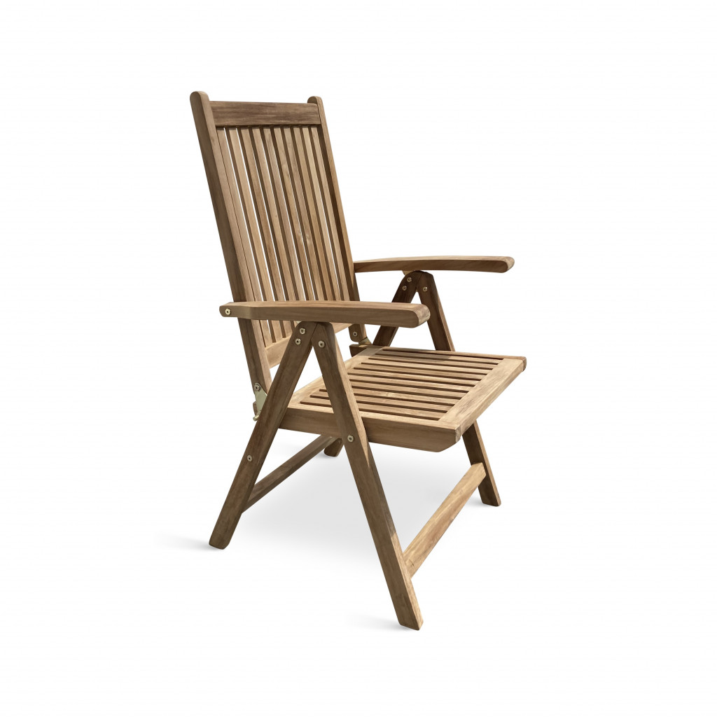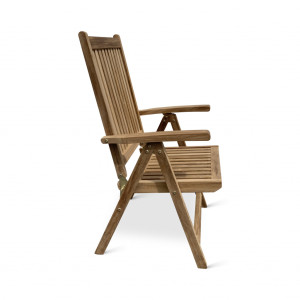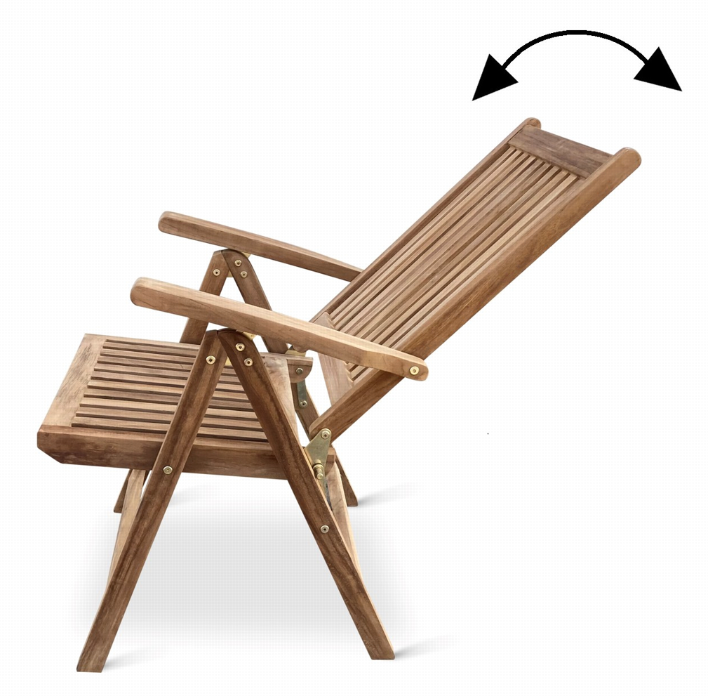 Opravdu pohodlná a stabilní teaková zahradní židle v provedení přírodní teak. Židle má 7 poloh nastavení sklonu opěradla a je velice rychle složená pro potřeby uložení. Klasický design polohovací židle s vysokou zádovou opěrkou zad o délce 70 cm a dvěma područkami. Nenáročná údržba, stačí pravidleně ošetřovat teakovým olejem pro zvýraznění kresby dřeva a ochranu proti povětrnostním vlivům.