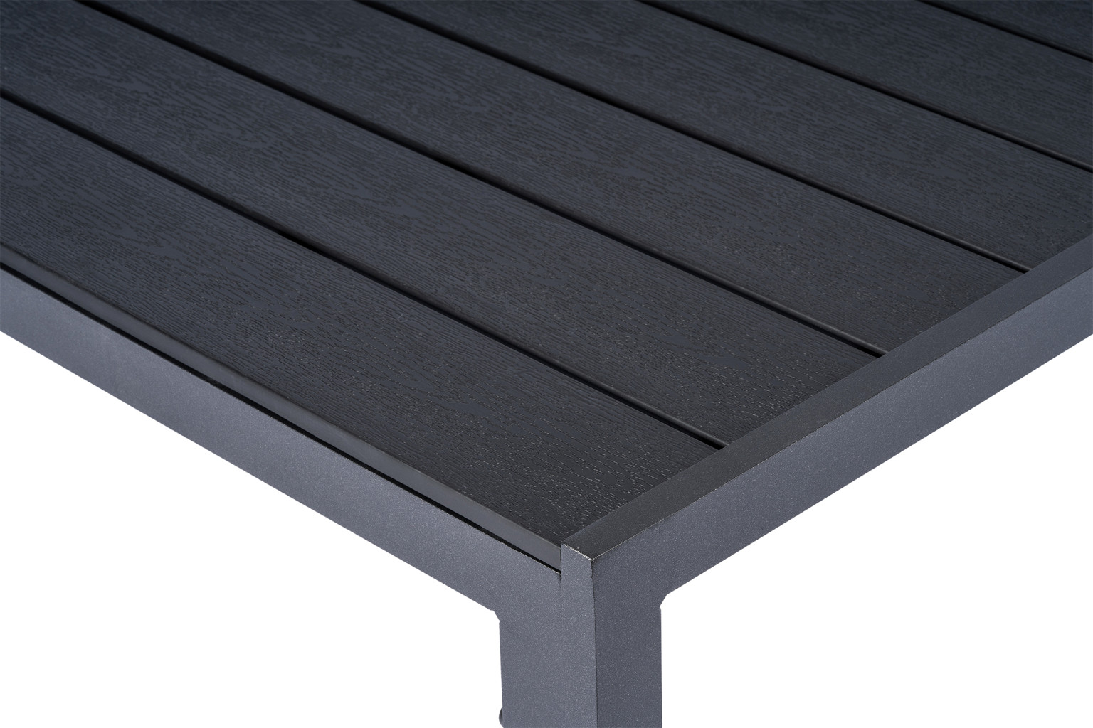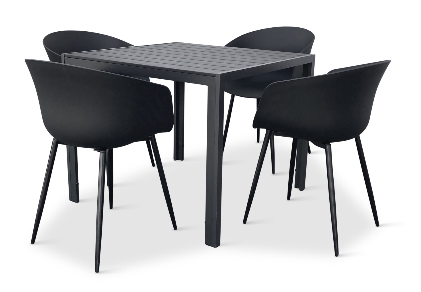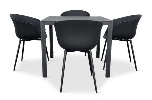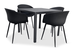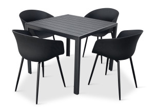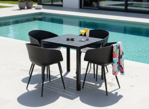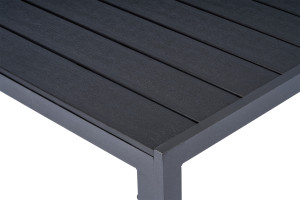 Sestava zahrnuje krásný a lehký stůl vyrobený z materiálů, které nevyžadují zvláštní údržbu. Konstrukce z hliníku ošetřeného proti rzi, deska stolu z artwoodu a adaptéry u nohou pro větší stabilitu. Umělé dřevo artwood v černé barvě věrně imituje strukturu a vzhled dřeva. Ani po několika sezónách neztratí svůj původní vzhled a stabilitu. Čtvercová deska stolu o rozměrech 90 x 90 cm je ideální do menší prostory, kde jste limitováni místem. Klasické tvary a černé provedení stolu.
