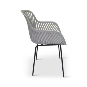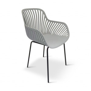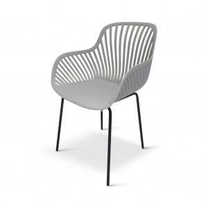 Součástí sestavy jsou i designová křesla GABY s područkou v šedé barvě vhodné i pro použití venku na zahradě. Křeslo tvoří sedák a opěrka z polypropylenu na 4 pevných nožkách z oceli. Zvolený vzdušný design opěrky oceníte zejména v letních měsících.