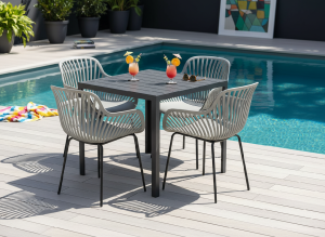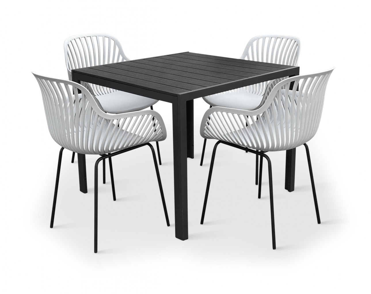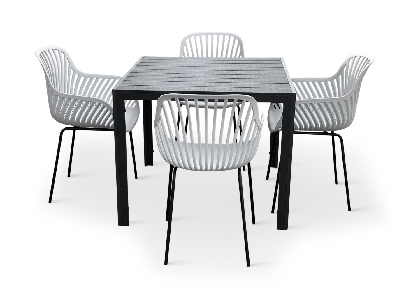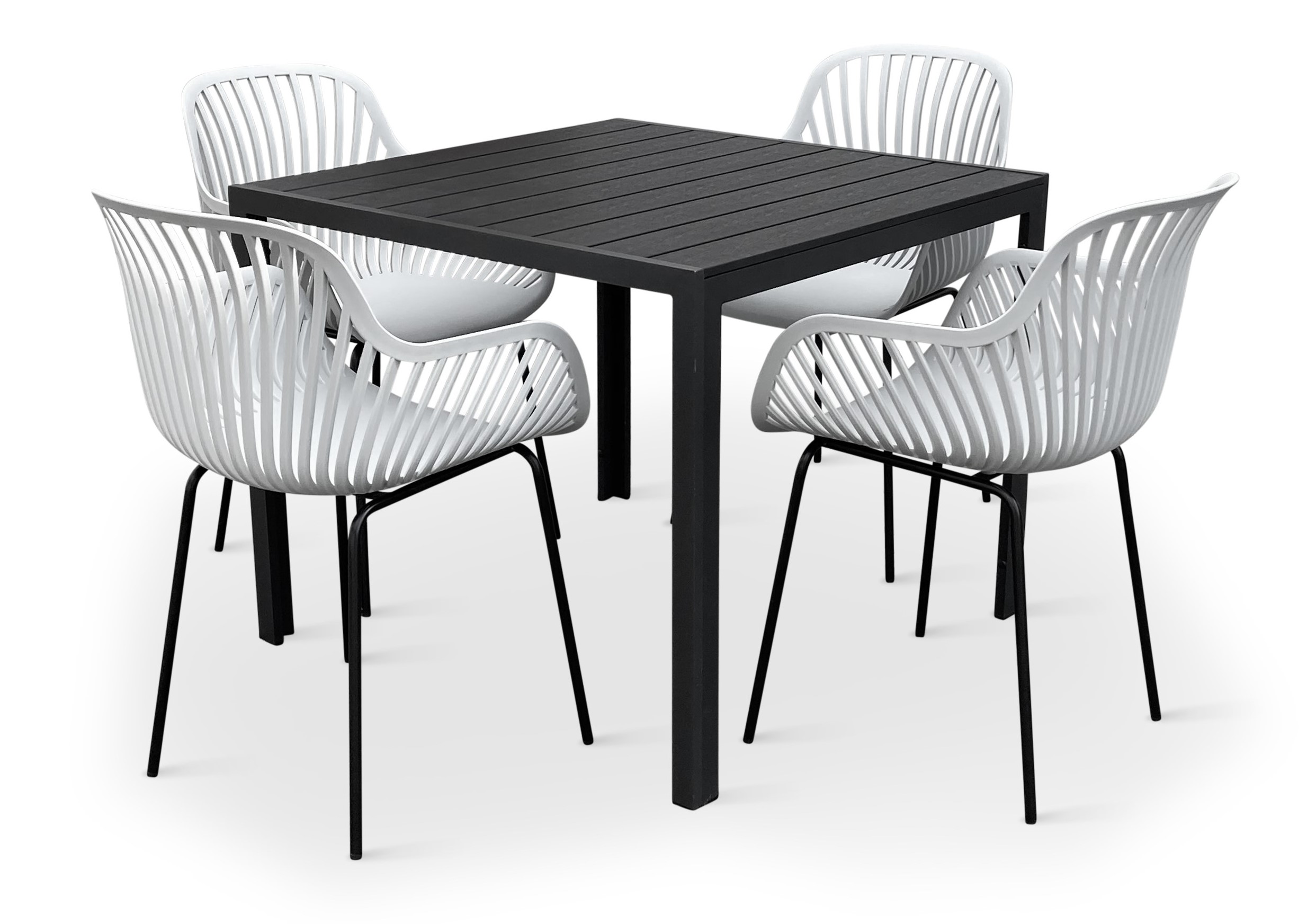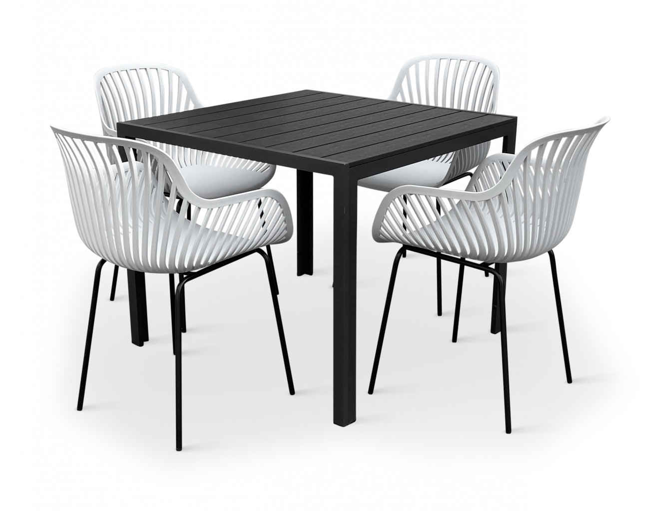 Sestava zahrnuje krásný a lehký stůl vyrobený z materiálů, které nevyžadují zvláštní údržbu. Konstrukce z hliníku ošetřeného proti rzi, deska stolu z artwoodu a adaptéry u nohou pro větší stabilitu. Umělé dřevo artwood v černé barvě věrně imituje strukturu a vzhled dřeva. Ani po několika sezónách neztratí svůj původní vzhled a stabilitu. Čtvercová deska stolu o rozměrech 90 x 90 cm je ideální do menší prostory, kde jste limitováni místem. Klasické tvary a černé provedení stolu.