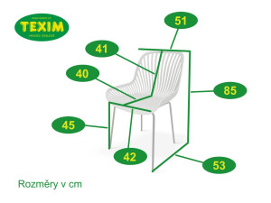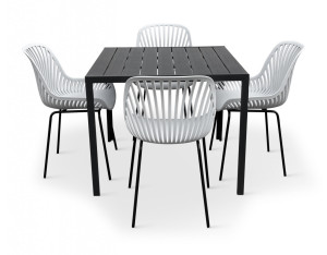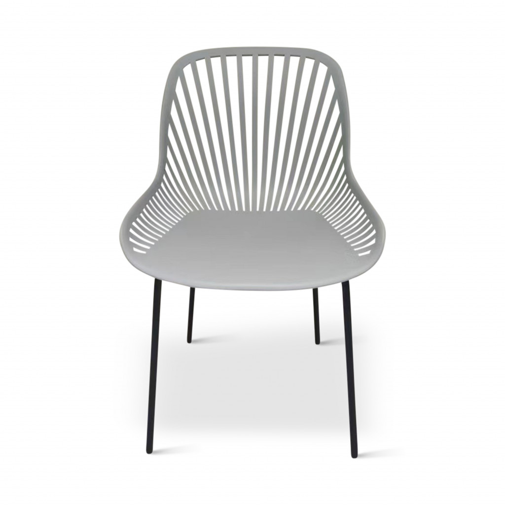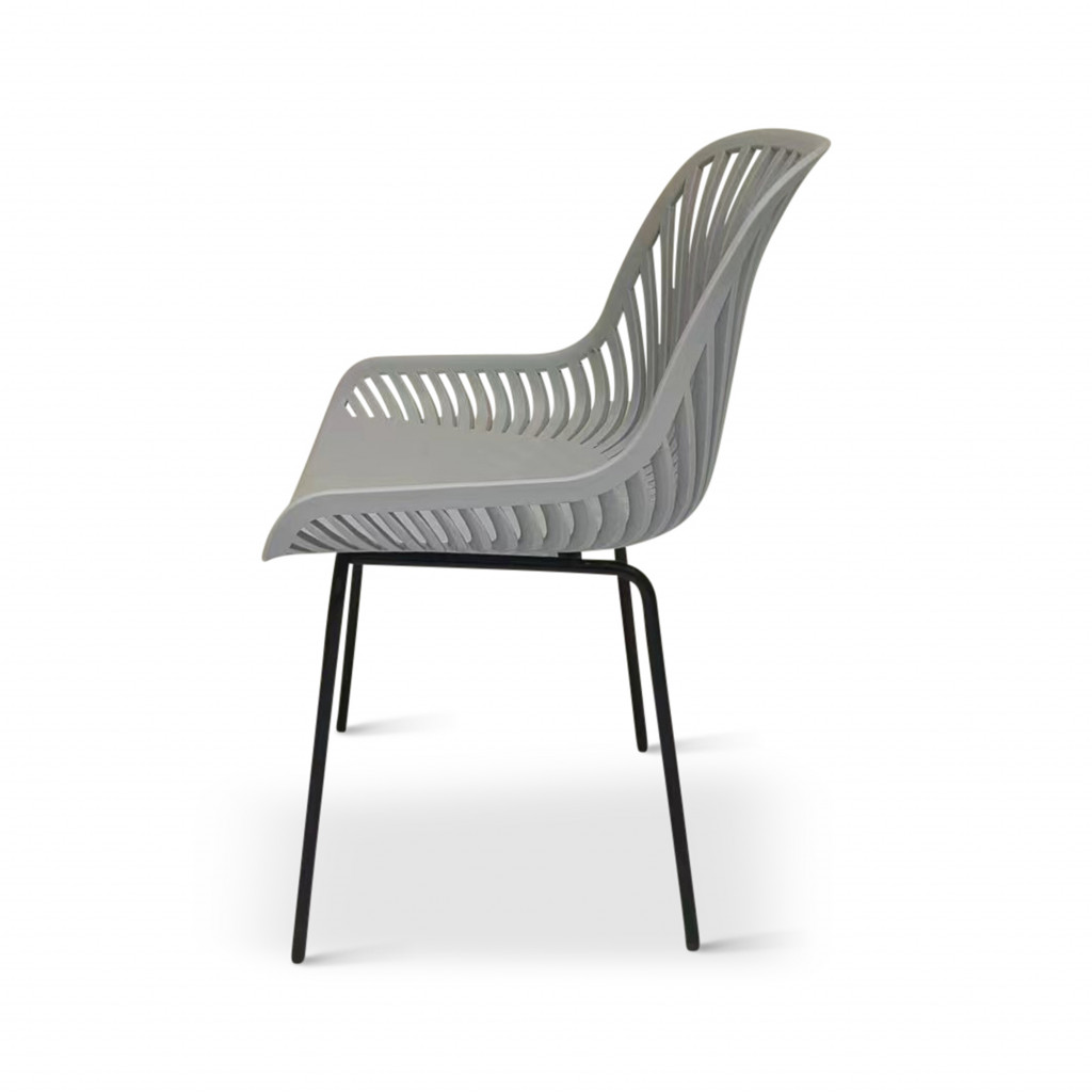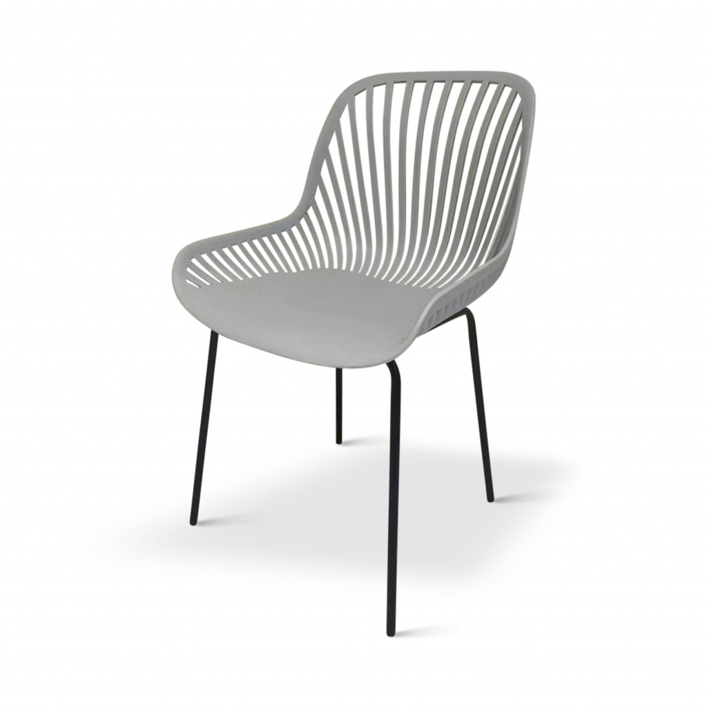 Součástí sestavy jsou i designové židle GABY v šedé barvě vhodné i pro použití venku na zahradě. Židli tvoří sedák a opěrka z polypropylenu na 4 pevných nožkách z oceli. Zvolený vzdušný design opěrky oceníte zejména v letních měsících.