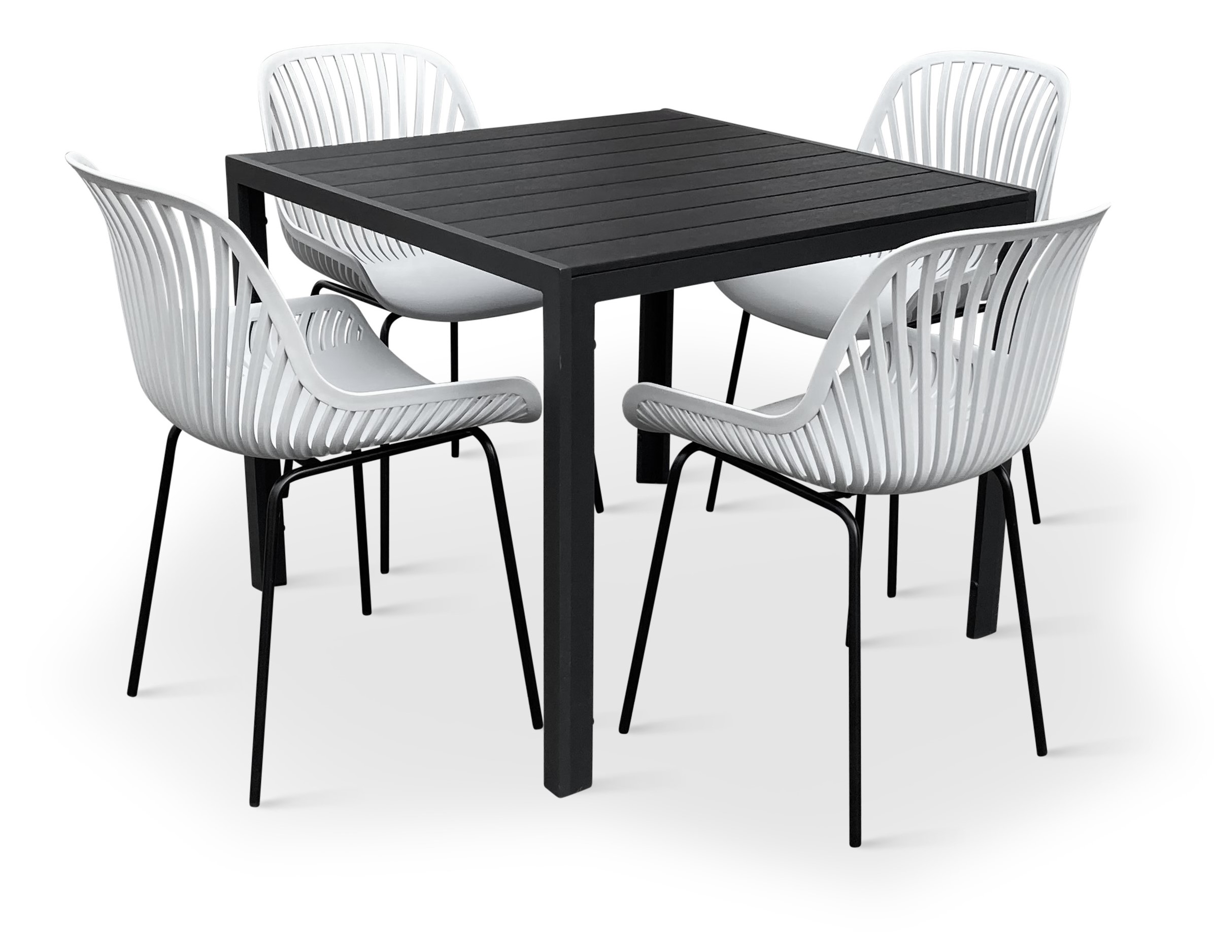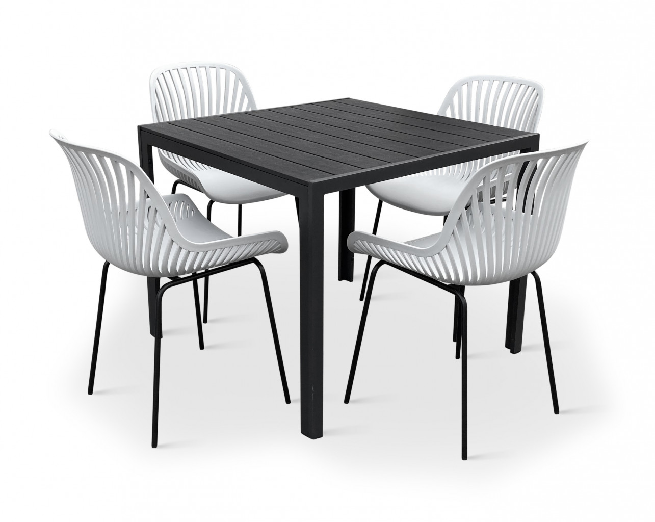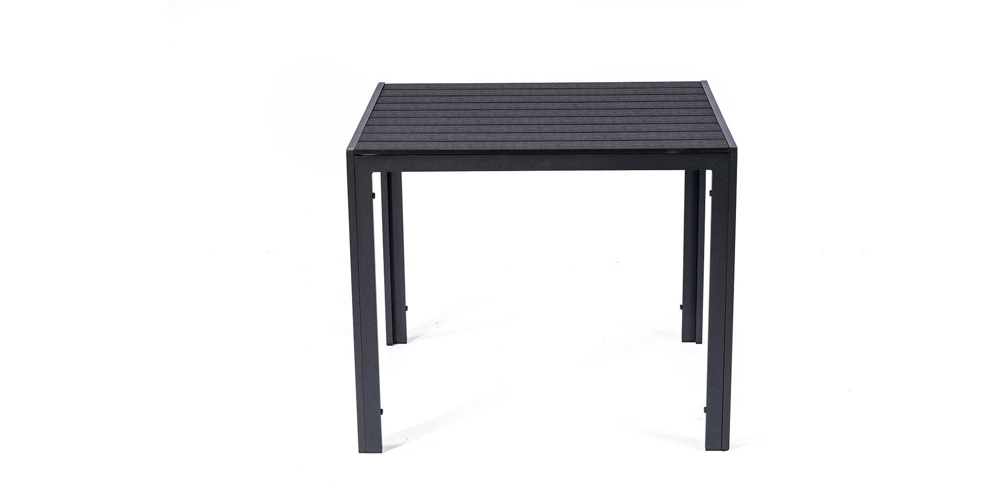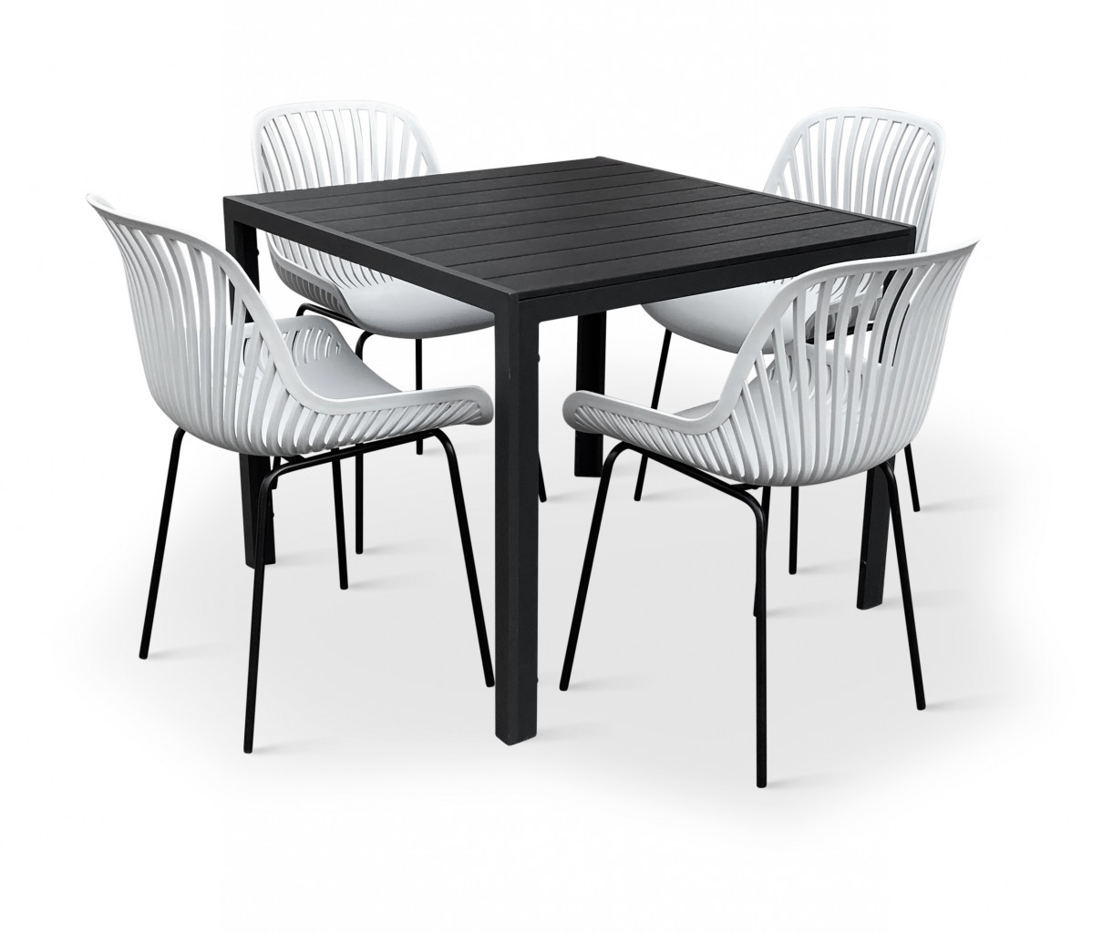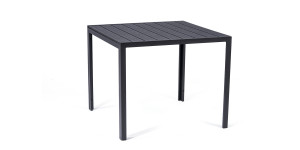 Sestava zahrnuje krásný a lehký stůl vyrobený z materiálů, které nevyžadují zvláštní údržbu. Konstrukce z hliníku ošetřeného proti rzi, deska stolu z artwoodu a adaptéry u nohou pro větší stabilitu. Umělé dřevo artwood v černé barvě věrně imituje strukturu a vzhled dřeva. Ani po několika sezónách neztratí svůj původní vzhled a stabilitu. Čtvercová deska stolu o rozměrech 90 x 90 cm je ideální do menší prostory, kde jste limitováni místem. Klasické tvary a černé provedení stolu.