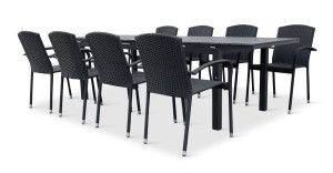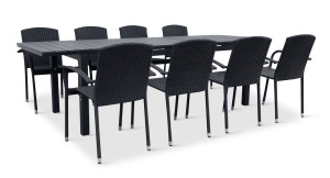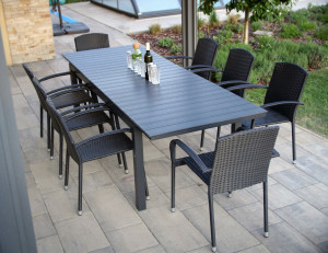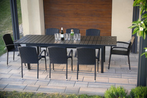 Jídelní stůl doplňují zahradní židle s ocelovou konstrukcí vypletenou umělým ratanem, které se hodí prakticky kamkoliv. Umělý ratan představuje velmi odolný materiál, který dobře snáší jakékoliv povětrnostní podmínky. Na slunci se nevyšisuje a po dlouhou dobu si uchovává svůj vzhled. Pro delší životnost byla ocelová konstrukce židle ošetřena proti rzi. Stohovatelné, téměř bezúdržbové židle s vyztuženým sedákem, který unese těžší váhy i po delší dobu.