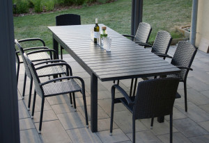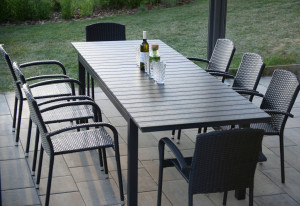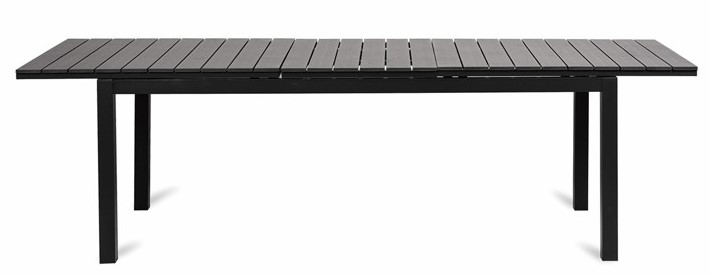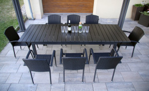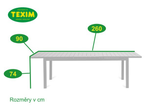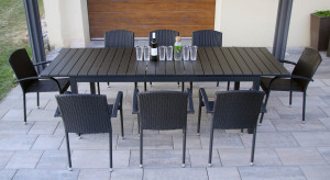 Sestava zahrnuje rozkládací a téměř bezúdržbový stůl vyrobený z hliníku, který doplňuje artwoodová deska. Pevná a stabilní konstrukce z hliníku byla pro delší životnost povrchově ošetřena proti rzi. Umělé dřevo artwood je syntetický materiál, který imituje skutečné dřevo. Navíc je odolný vůči povětrnostním vlivům. Nevyšisuje barvu, nepropustí vodu a nenapadnou jej dřevokazní parazité. Stůl je možné rozložit na 2 rozměry. Snadno prodloužíte délku stolu z 195 cm na 260 cm.