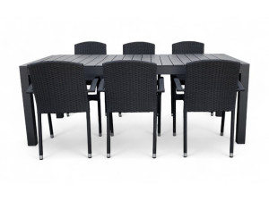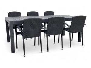 Sestava zahrnuje masivní, rozkládací a téměř bezúdržbový stůl vyrobený z hliníku, který disponuje artwoodovou deskou. Stůl je možné rozložit na 2 rozměry. Snadno prodloužíte délku stolu z 205 cm na 275 cm. Adaptéry u nohou pro vyrovnání stability. Pevná a stabilní konstrukce z hliníku byla pro delší životnost ošetřena proti rzi.