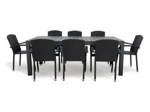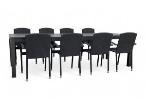 Jídelní stůl doplňují zahradní židle s ocelovou konstrukcí vypletenou umělým ratanem, které se hodí prakticky kamkoliv. Umělý ratan představuje velmi odolný materiál, který dobře snáší jakékoliv povětrnostní podmínky. Na slunci se nevyšisuje a po dlouhou dobu si uchovává svůj vzhled. Pro delší životnost byla ocelová konstrukce židle ošetřena proti rzi. Stohovatelné, téměř bezúdržbové židle s vyztuženým sedákem, který unese těžší váhy i po delší dobu.