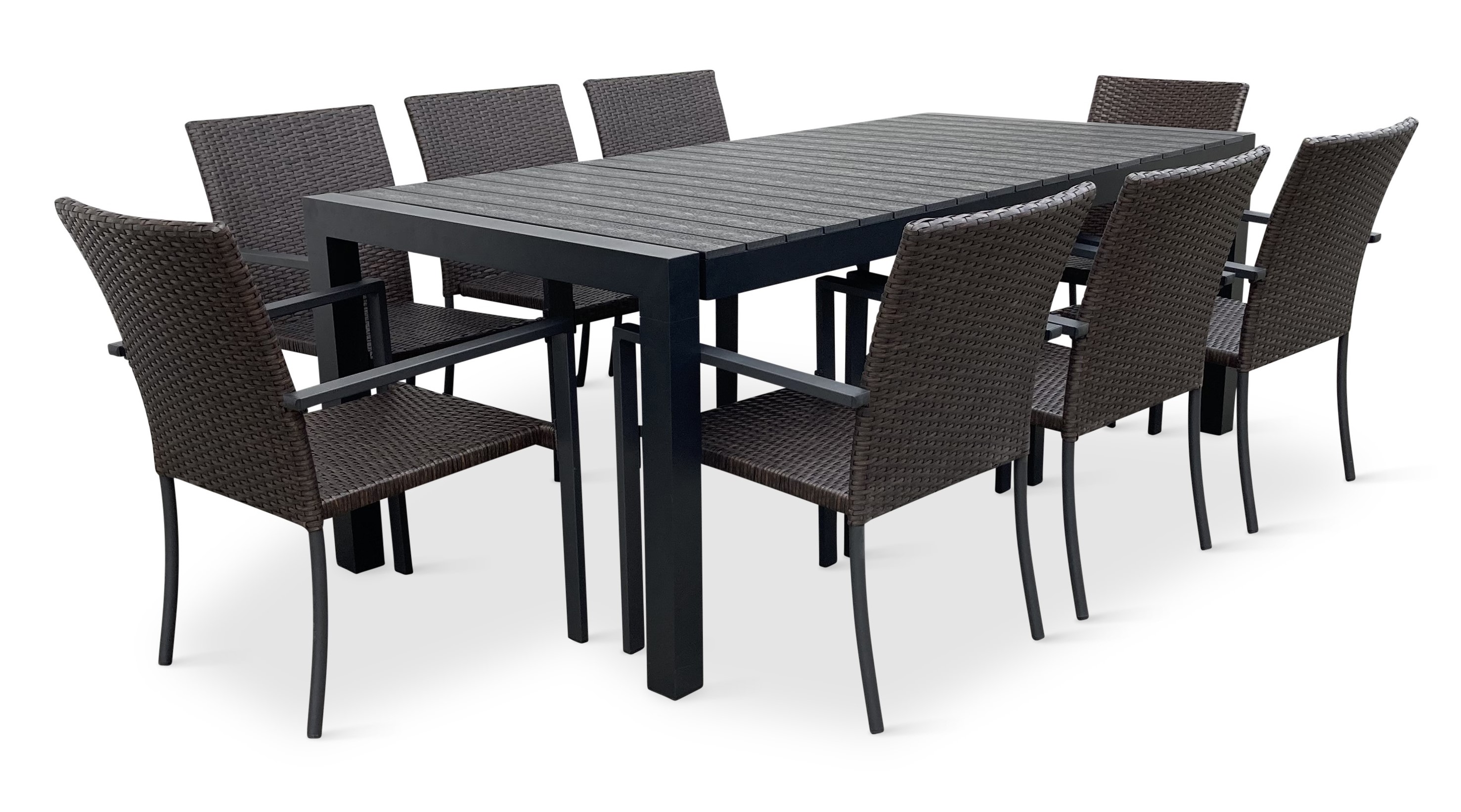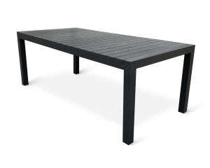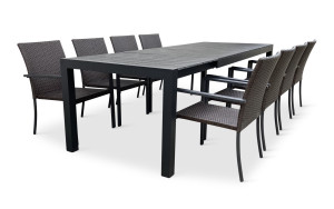 Sestava zahrnuje masivní, rozkládací a téměř bezúdržbový stůl vyrobený z hliníku, který doplňuje artwoodová deska. Stůl je možné rozložit na 2 rozměry. Snadno prodloužíte délku stolu z 205 cm na 275 cm. Adaptéry u nohou pro vyrovnání stability. Pevná a stabilní konstrukce z hliníku byla pro delší životnost ošetřena proti rzi.