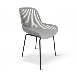 Součástí sestavy jsou i designové židle GABY v šedé barvě vhodné i pro použití venku na zahradě. Židli tvoří sedák a opěrka z polypropylenu na 4 pevných nožkách z oceli. Zvolený vzdušný design opěrky oceníte zejména v letních měsících.