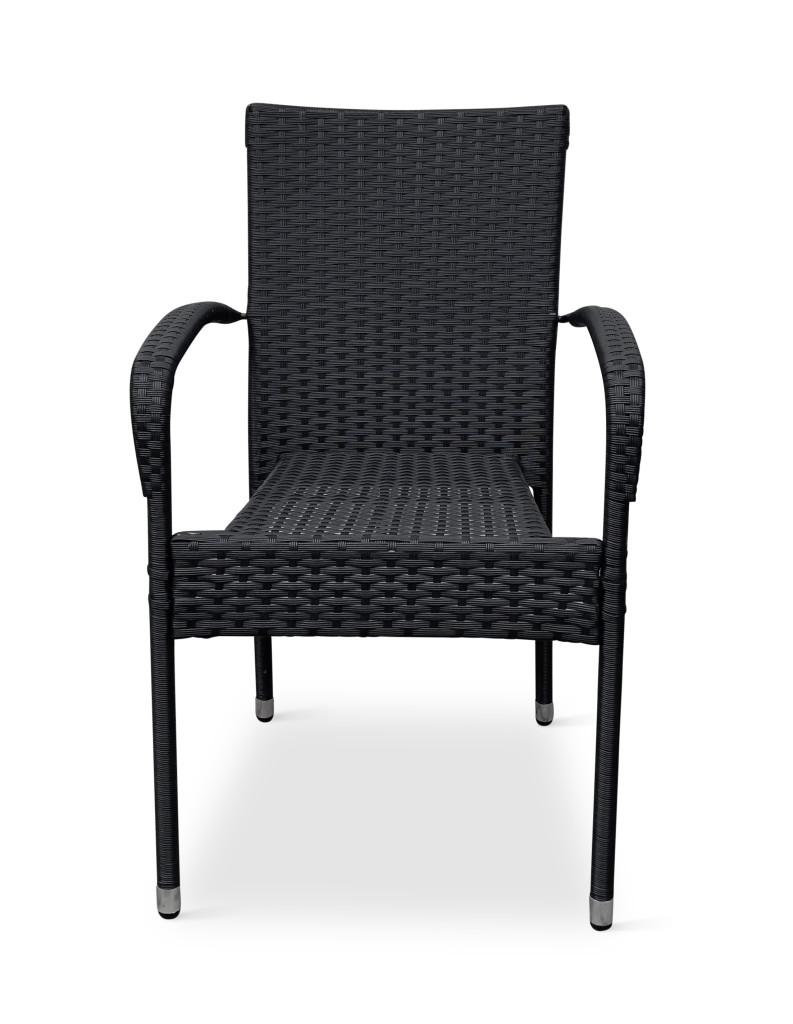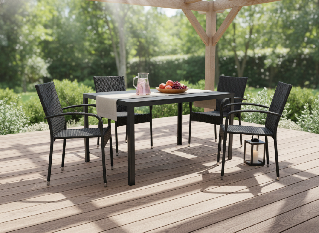 Jídelní stůl doplňují zahradní židle s ocelovou konstrukcí vypletenou umělým ratanem, které se hodí prakticky kamkoliv. Umělý ratan představuje velmi odolný materiál, který dobře snáší jakékoliv povětrnostní podmínky. Na slunci se nevyšisuje a po dlouhou dobu si uchovává svůj vzhled. Pro delší životnost byla ocelová konstrukce židle ošetřena proti rzi. Stohovatelné, téměř bezúdržbové židle s vyztuženým sedákem, který unese těžší váhy i po delší dobu.