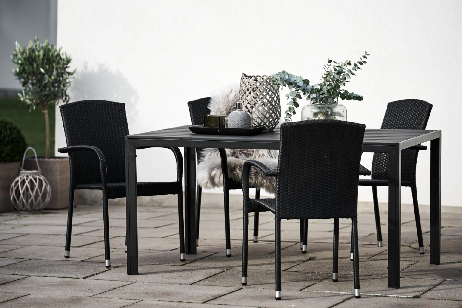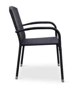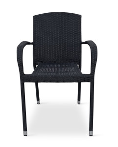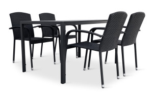 Jídelní stůl doplňují zahradní židle s ocelovou konstrukcí vypletenou umělým ratanem, které se hodí prakticky kamkoliv. Umělý ratan představuje velmi odolný materiál, který dobře snáší jakékoliv povětrnostní podmínky. Na slunci se nevyšisuje a po dlouhou dobu si uchovává svůj vzhled. Pro delší životnost byla ocelová konstrukce židle ošetřena proti rzi. Stohovatelné, téměř bezúdržbové židle s vyztuženým sedákem, který unese těžší váhy i po delší dobu.