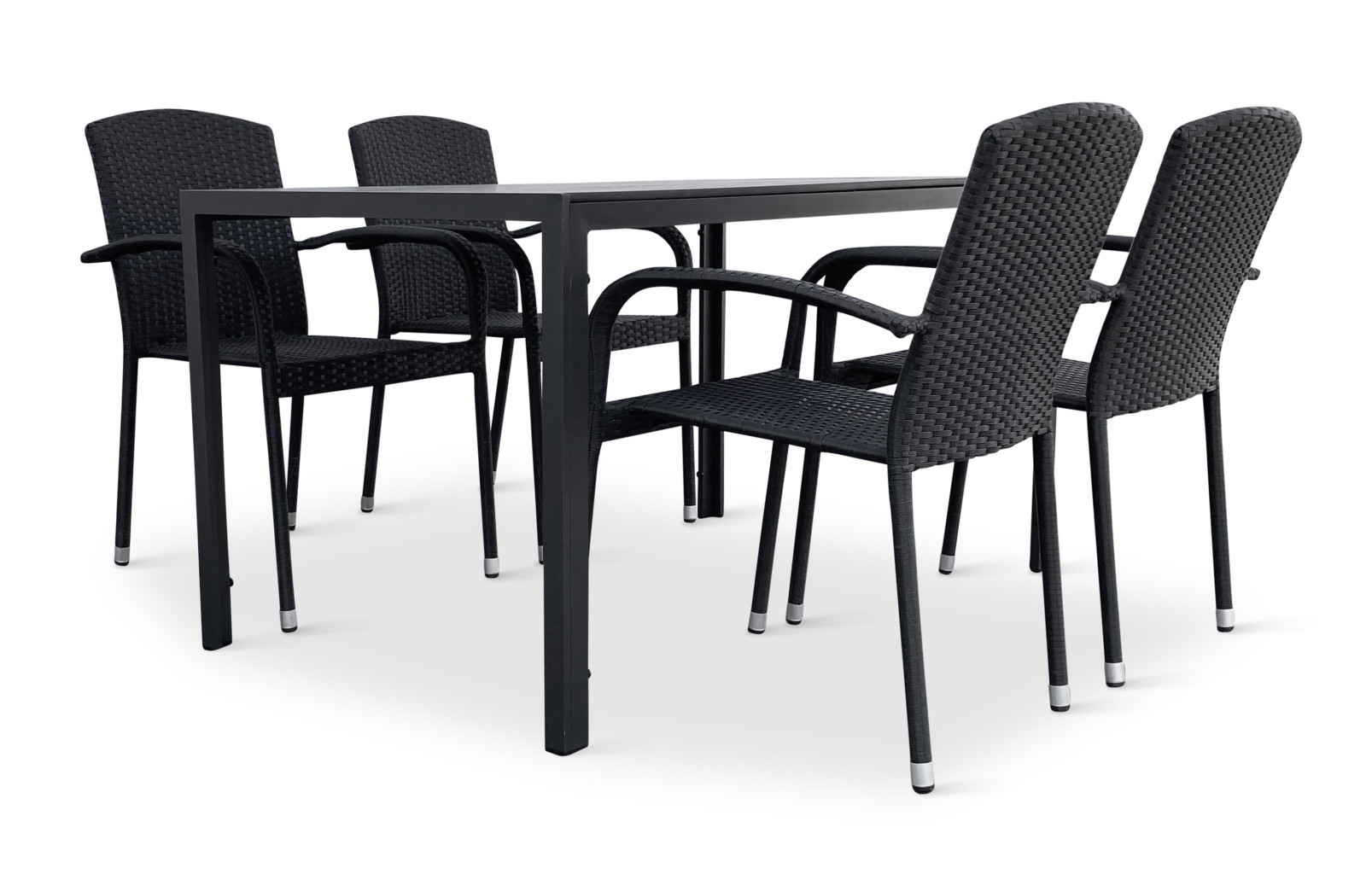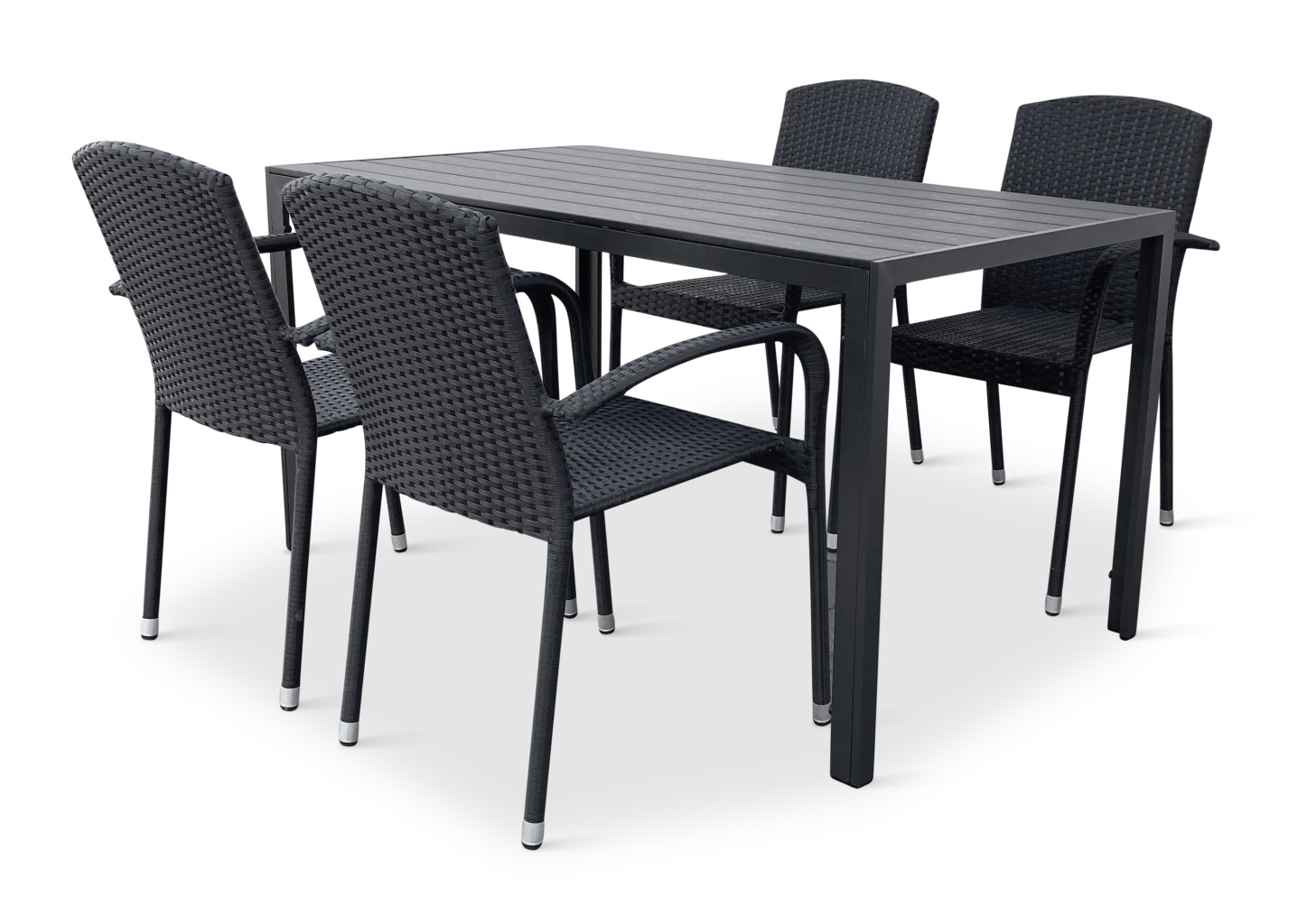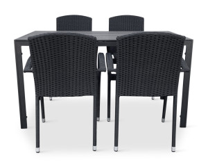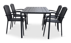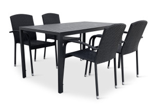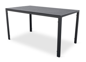 Sestava zahrnuje krásný a lehký stůl vyrobený z materiálů, které nevyžadují zvláštní údržbu. Konstrukce z hliníku ošetřeného proti rzi, deska stolu z artwoodu a adaptéry u nohou pro větší stabilitu. Umělé dřevo artwood v černé barvě věrně imituje strukturu a vzhled dřeva. Ani po několika sezónách neztratí svůj původní vzhled a stabilitu. Klasické tvary a černé provedení stolu.