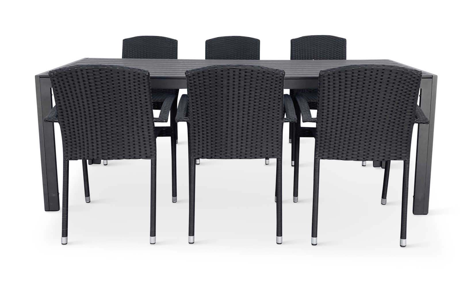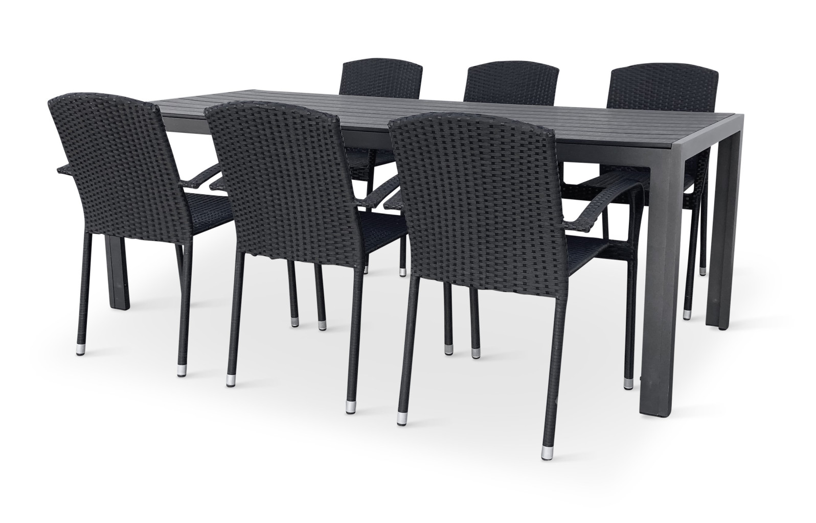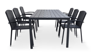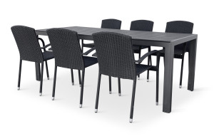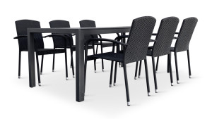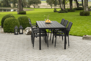 Sestava zahrnuje krásný a lehký stůl vyrobený z materiálů, které nevyžadují zvláštní údržbu. Konstrukce z hliníku ošetřeného proti rzi, deska stolu z artwoodu a adaptéry u nohou pro větší stabilitu. Umělé dřevo artwood v černé barvě věrně imituje strukturu a vzhled dřeva. Ani po několika sezónách neztratí svůj původní vzhled a stabilitu. Klasické tvary a černé provedení stolu.