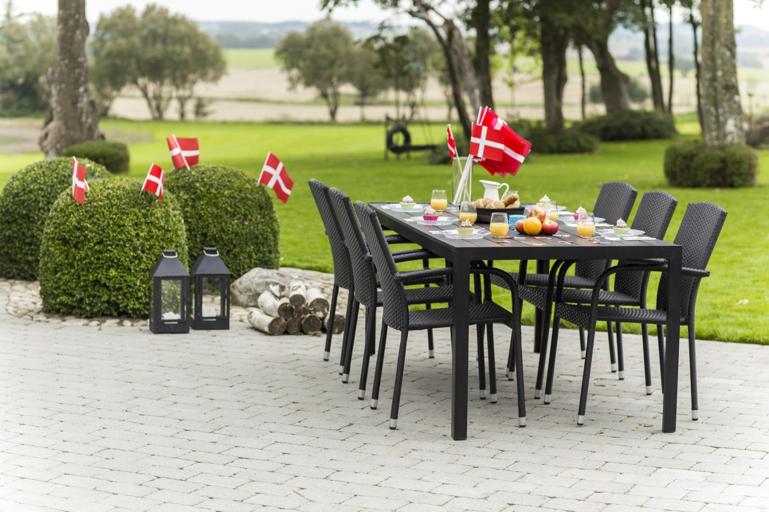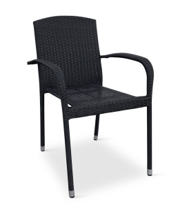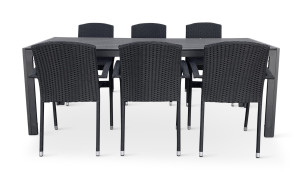 Jídelní stůl doplňují zahradní židle s ocelovou konstrukcí vypletenou umělým ratanem, které se hodí prakticky kamkoliv. Umělý ratan představuje velmi odolný materiál, který dobře snáší jakékoliv povětrnostní podmínky. Na slunci se nevyšisuje a po dlouhou dobu si uchovává svůj vzhled. Pro delší životnost byla ocelová konstrukce židle ošetřena proti rzi. Stohovatelné, téměř bezúdržbové židle s vyztuženým sedákem, který unese těžší váhy i po delší dobu.
