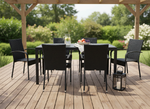 Jídelní stůl doplňují zahradní židle s ocelovou konstrukcí vypletenou umělým ratanem, které se hodí prakticky kamkoliv. Umělý ratan představuje velmi odolný materiál, který dobře snáší jakékoliv povětrnostní podmínky. Na slunci se nevyšisuje a po dlouhou dobu si uchovává svůj vzhled. Pro delší životnost byla ocelová konstrukce židle ošetřena proti rzi. Stohovatelné, téměř bezúdržbové židle s vyztuženým sedákem, který unese těžší váhy i po delší dobu.