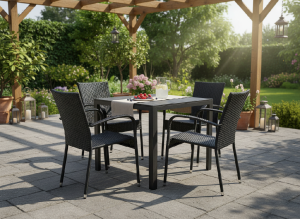 Jídelní stůl doplňují zahradní židle s ocelovou konstrukcí vypletenou umělým ratanem, které se hodí prakticky kamkoliv. Umělý ratan představuje velmi odolný materiál, který dobře snáší jakékoliv povětrnostní podmínky. Na slunci se nevyšisuje a po dlouhou dobu si uchovává svůj vzhled. Pro delší životnost byla ocelová konstrukce židle ošetřena proti rzi. Stohovatelné, téměř bezúdržbové židle s vyztuženým sedákem, který unese těžší váhy i po delší dobu.
