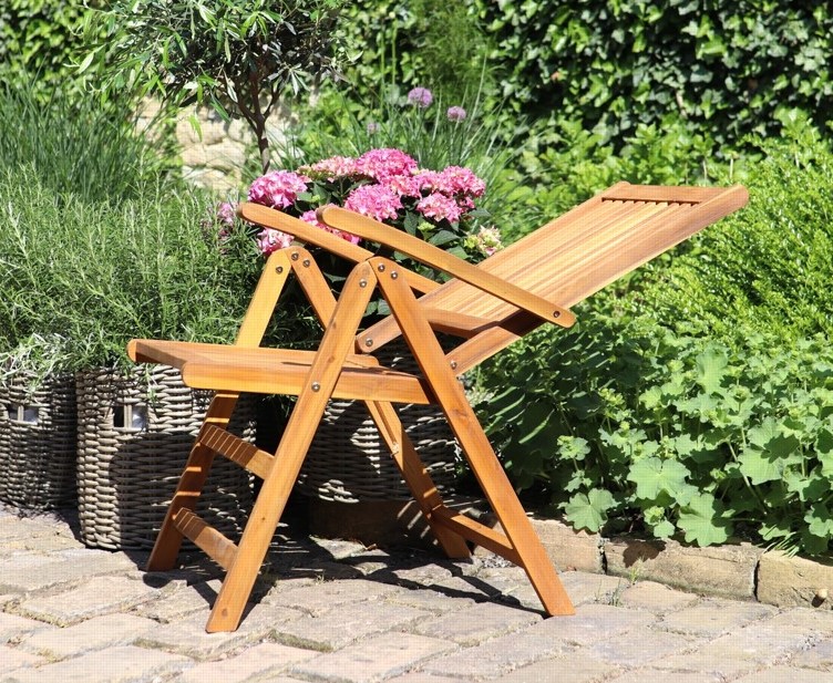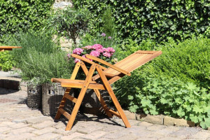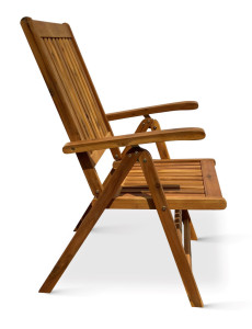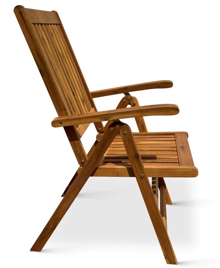 Polohovací zahradní židle z tvrdého akáciového dřeva. Široké područky pro pohodlné sezení a rychlá možnost složení židle pro potřebu uložení. Opěrku zahradní židle Viet si můžete podle potřeby nastavit až do 8 poloh. Nenáročná údržba, stačí pravidelně ošetřovat ochranným olejem na tropické dřeviny. Ochráníte tím materiál židle a prodloužíte její životnost. Akáciové dřevo odolává povětrnostním vlivům, židli tak využijete v interiéru i exteriéru.