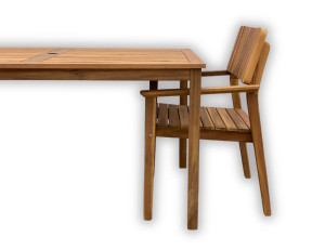 Jídelní stůl doplňují stohovatelná křesla LUCY s područkami vyrobená z kvalitní exotické dřeviny akácie. Křeslo disponuje prostorným sedákem o rozměrech 46 x 48 cm. Křesla lze stohovat a nezaberou při uložení mnoho místa. Zvolená poměrně robustní konstrukce není v kategorii akáciového nábytku obvyklá.