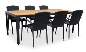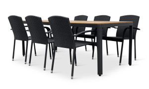 Jídelní stůl doplňují zahradní židle s ocelovou konstrukcí vypletenou umělým ratanem, které se hodí prakticky kamkoliv. Umělý ratan představuje velmi odolný materiál, který dobře snáší jakékoliv povětrnostní podmínky. Na slunci se nevyšisuje a po dlouhou dobu si uchovává svůj vzhled. Pro delší životnost byla ocelová konstrukce židle ošetřena proti rzi. Stohovatelné, téměř bezúdržbové židle s vyztuženým sedákem, který unese těžší váhy i po delší dobu.