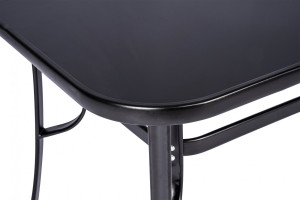 Sestava zahrnuje stabilní stůl s kovovou konstrukcí z oceli a skleněnou deskou. Deska stolu vyrobená z černého tvrzeného skla disponuje otvorem pro slunečník o průměru 4,5 cm. Stůl dodáváme včetně plastové záslepky pro případ, kdy otvor pro slunečník nebudete využívat. Kovové části stolu byly ošetřeny proti rzi. Praktický stůl z téměř bezúdržbových omyvatelných materiálů, který svým jednoduchým univerzálním designem zapadne do všech venkovních prostor.