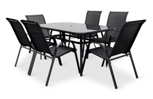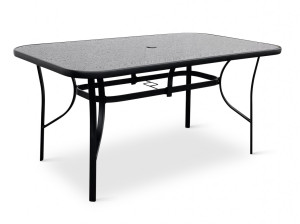 Sestava zahrnuje stabilní stůl s kovovou konstrukcí z oceli a skleněnou deskou. Deska stolu vyrobená z černého tvrzeného skla disponuje otvorem pro slunečník o průměru 4,5 cm. Stůl dodáváme včetně plastové záslepky pro případ, kdy otvor pro slunečník nebudete využívat. Kovové části stolu byly ošetřeny proti rzi. Praktický stůl z téměř bezúdržbových omyvatelných materiálů, který svým jednoduchým univerzálním designem zapadne do všech venkovních prostor.