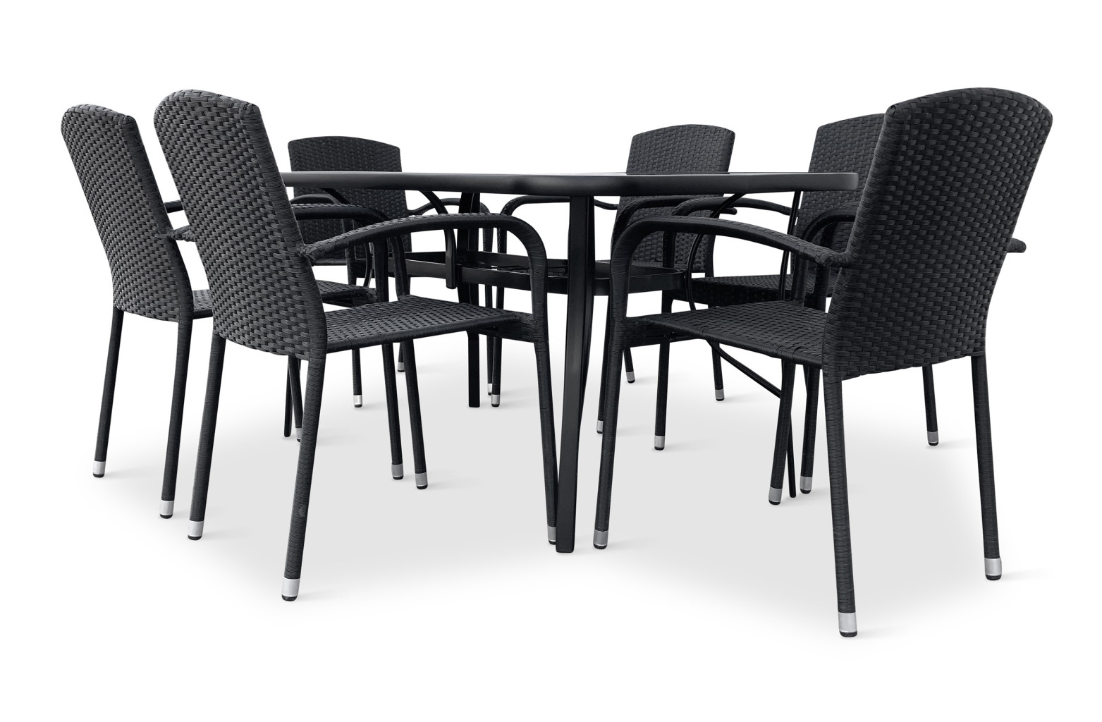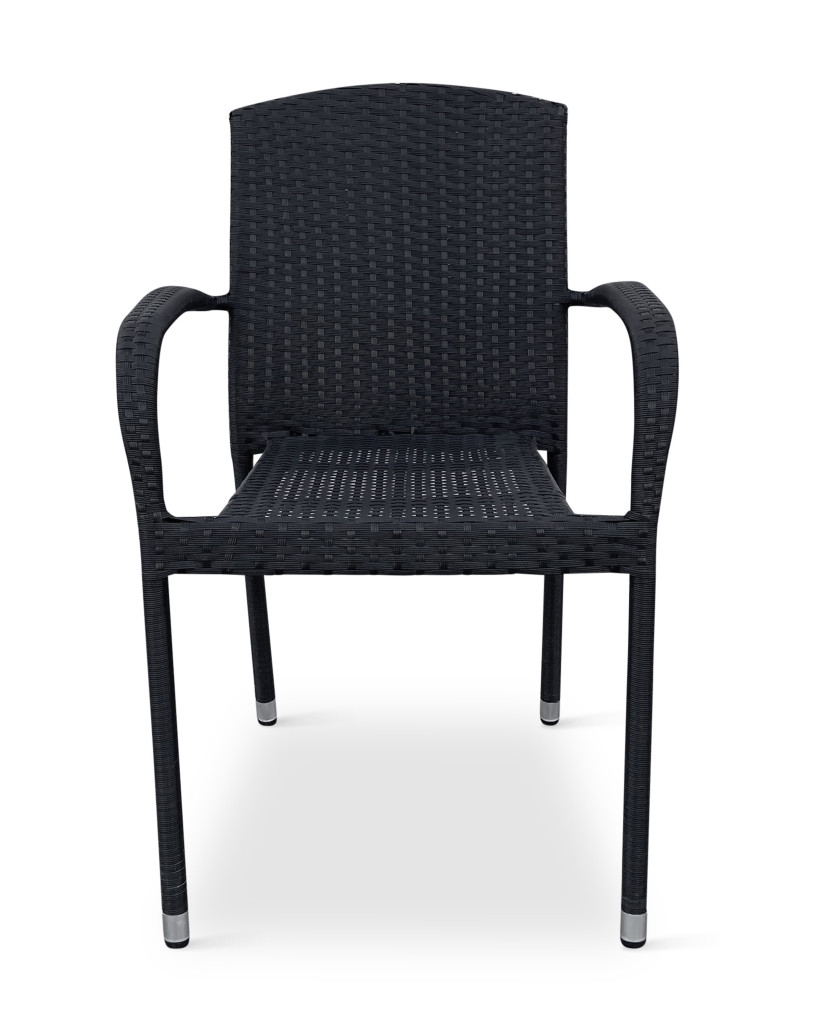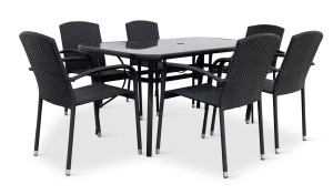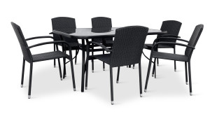 Jídelní stůl doplňují zahradní židle s ocelovou konstrukcí vypletenou umělým ratanem, které se hodí prakticky kamkoliv. Umělý ratan představuje velmi odolný materiál, který dobře snáší jakékoliv povětrnostní podmínky. Na slunci se nevyšisuje a po dlouhou dobu si uchovává svůj vzhled. Pro delší životnost byla ocelová konstrukce židle ošetřena proti rzi. Stohovatelné, téměř bezúdržbové židle s vyztuženým sedákem, který unese těžší váhy i po delší dobu.