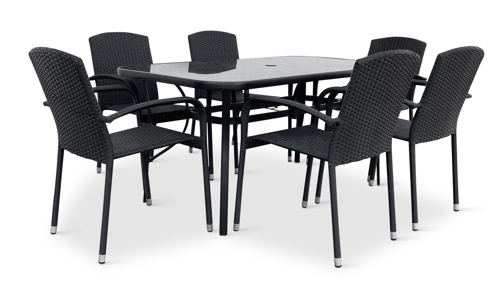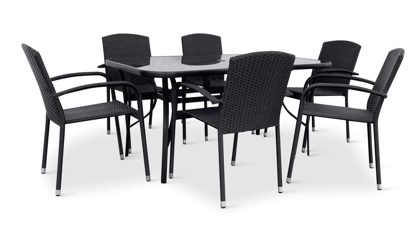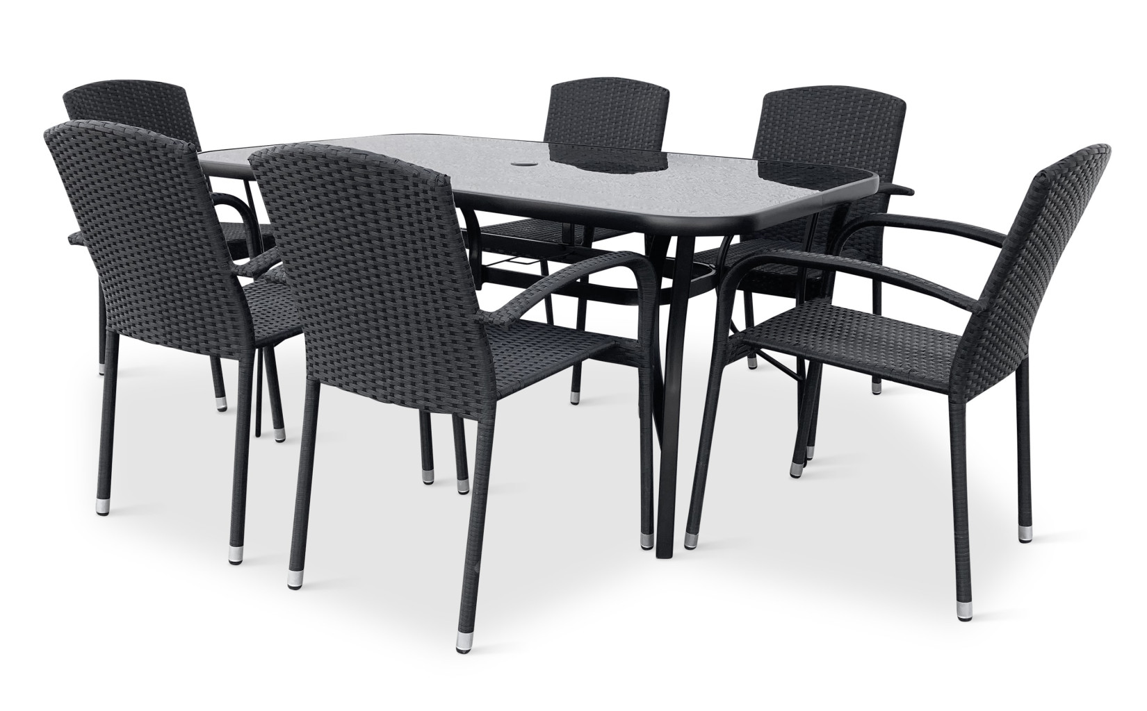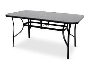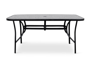 Sestava zahrnuje stabilní stůl s kovovou konstrukcí z oceli a skleněnou deskou. Deska stolu vyrobená z černého tvrzeného skla disponuje otvorem pro slunečník o průměru 4,5 cm. Stůl dodáváme včetně plastové záslepky pro případ, kdy otvor pro slunečník nebudete využívat. Kovové části stolu byly ošetřeny proti rzi. Praktický stůl z téměř bezúdržbových omyvatelných materiálů, který svým jednoduchým univerzálním designem zapadne do všech venkovních prostor.