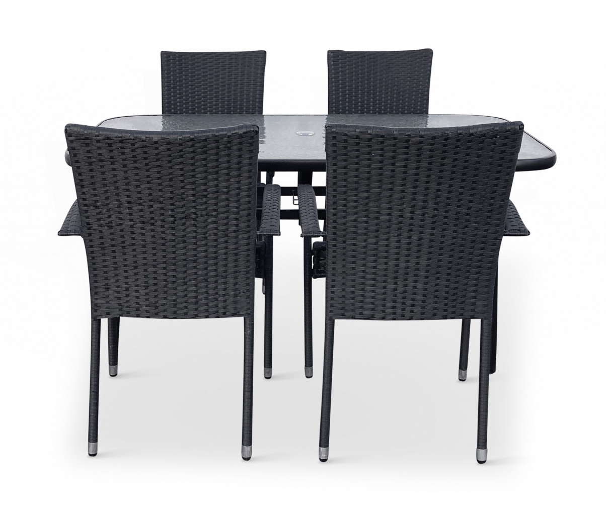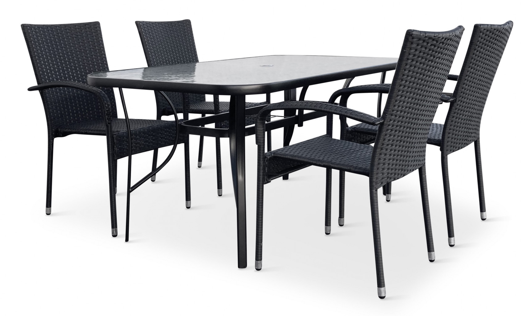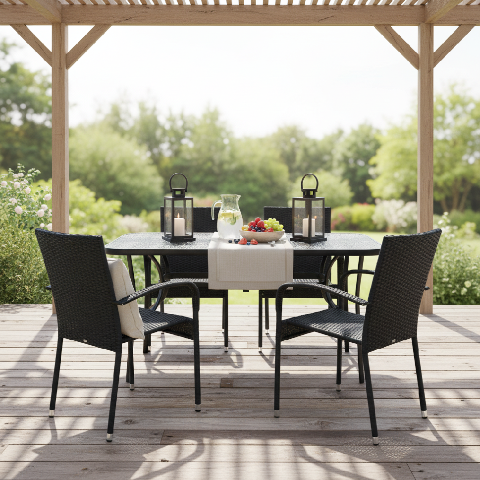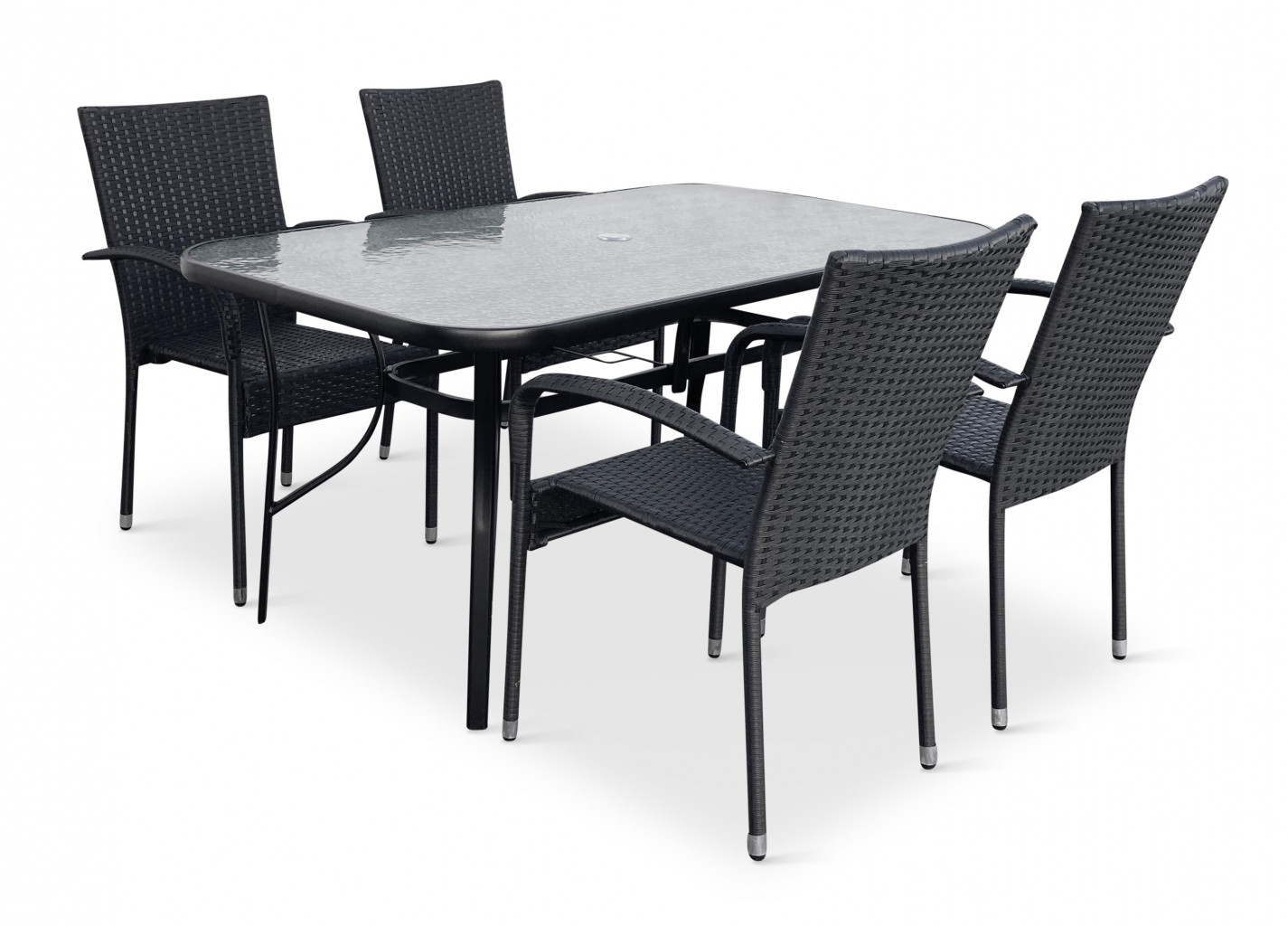Jídelní stůl doplňují zahradní židle s ocelovou konstrukcí vypletenou umělým ratanem, které se hodí prakticky kamkoliv. Umělý ratan představuje velmi odolný materiál, který dobře snáší jakékoliv povětrnostní podmínky. Na slunci se nevyšisuje a po dlouhou dobu si uchovává svůj vzhled. Pro delší životnost byla ocelová konstrukce židle ošetřena proti rzi. Stohovatelné, téměř bezúdržbové židle s vyztuženým sedákem, který unese těžší váhy i po delší dobu. V sestavě dodáváme demontovatelnou verzi velmi oblíbené zahradní židle Paris.