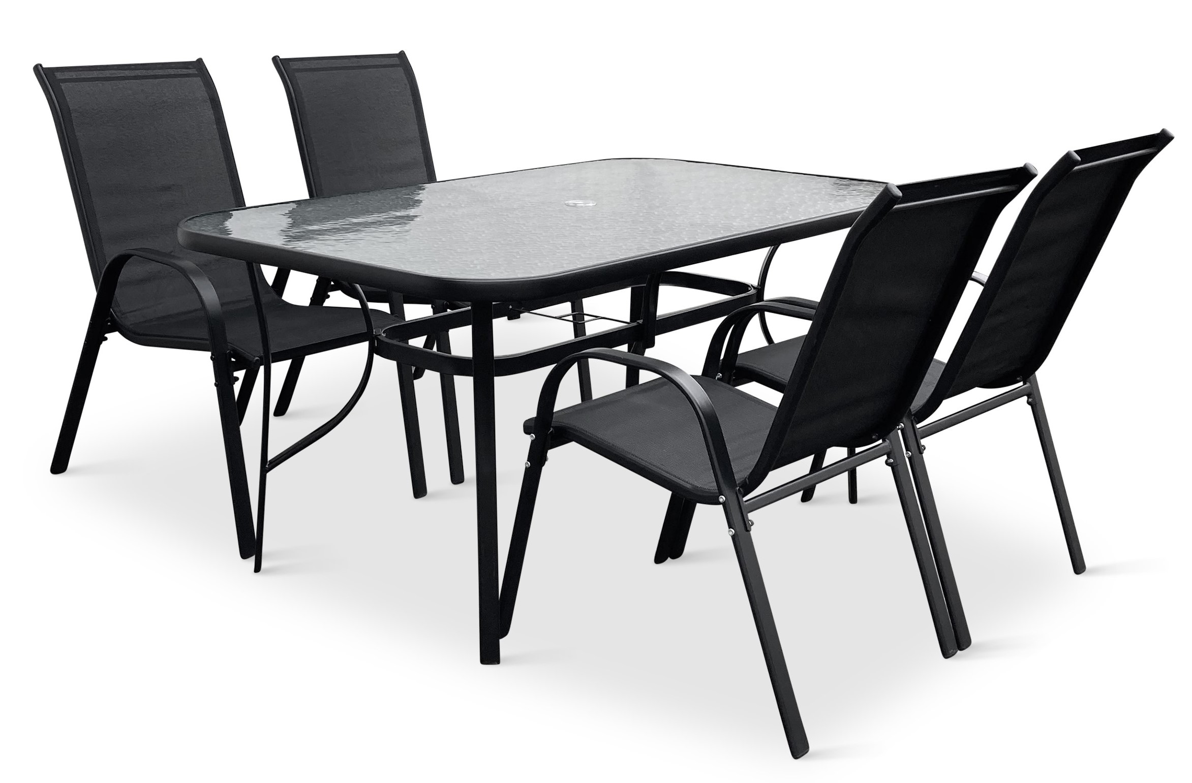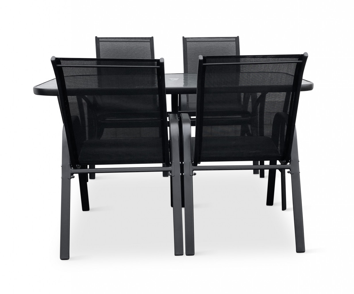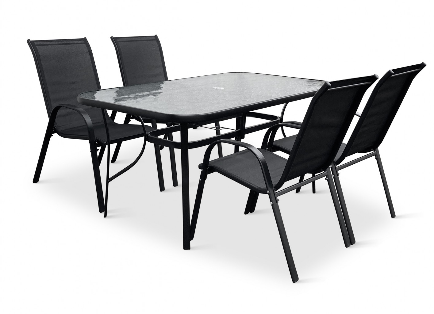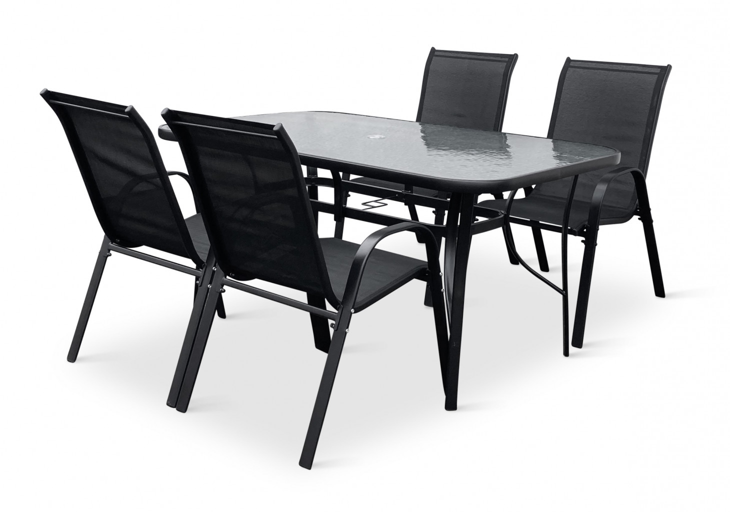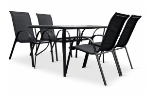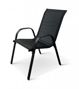 Jídelní stůl doplňují odolné stohovatelné židle s ocelovou konstrukcí a vzdušnou textilií. Vzdušná textilie, ze které je vyroben sedák, je ideální na léto a díky inteligentnímu tvarování velice pohodlná. Židle lze jednoduše naskládat na sebe a nezaberou vám mnoho místa při uložení. Vhodná pro nekomerční použití. Pro delší životnost neskladovat židle ve vlhkých prostorách a nenechávat na dešti.