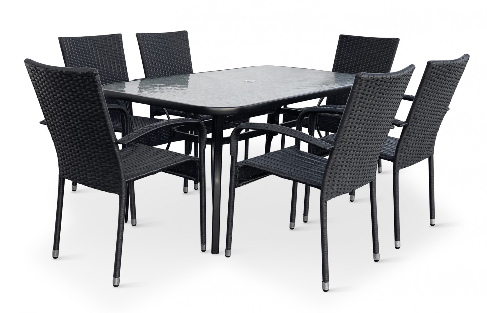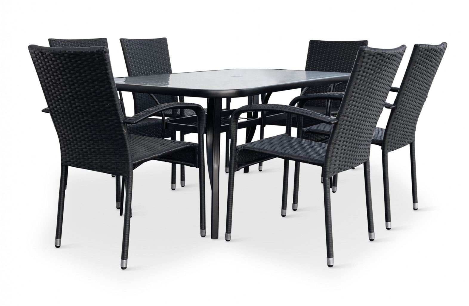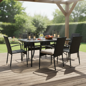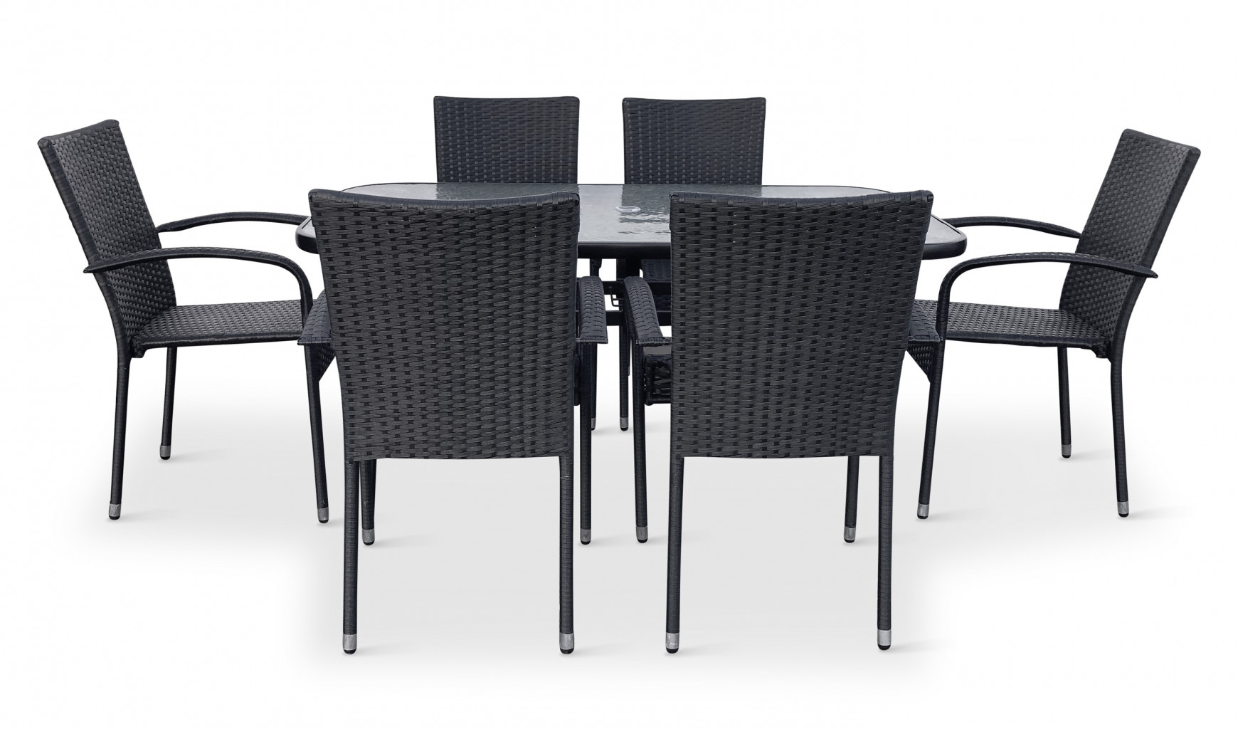 Jídelní stůl doplňují zahradní židle s ocelovou konstrukcí vypletenou umělým ratanem, které se hodí prakticky kamkoliv. Umělý ratan představuje velmi odolný materiál, který dobře snáší jakékoliv povětrnostní podmínky. Na slunci se nevyšisuje a po dlouhou dobu si uchovává svůj vzhled. Pro delší životnost byla ocelová konstrukce židle ošetřena proti rzi. Stohovatelné, téměř bezúdržbové židle s vyztuženým sedákem, který unese těžší váhy i po delší dobu. V sestavě dodáváme demontovatelnou verzi velmi oblíbené zahradní židle Paris.
