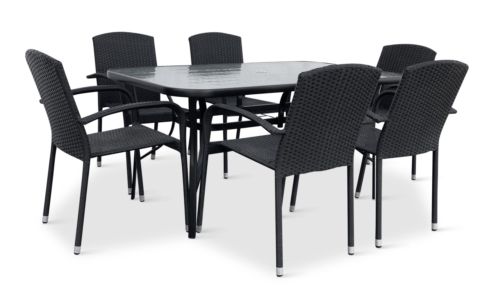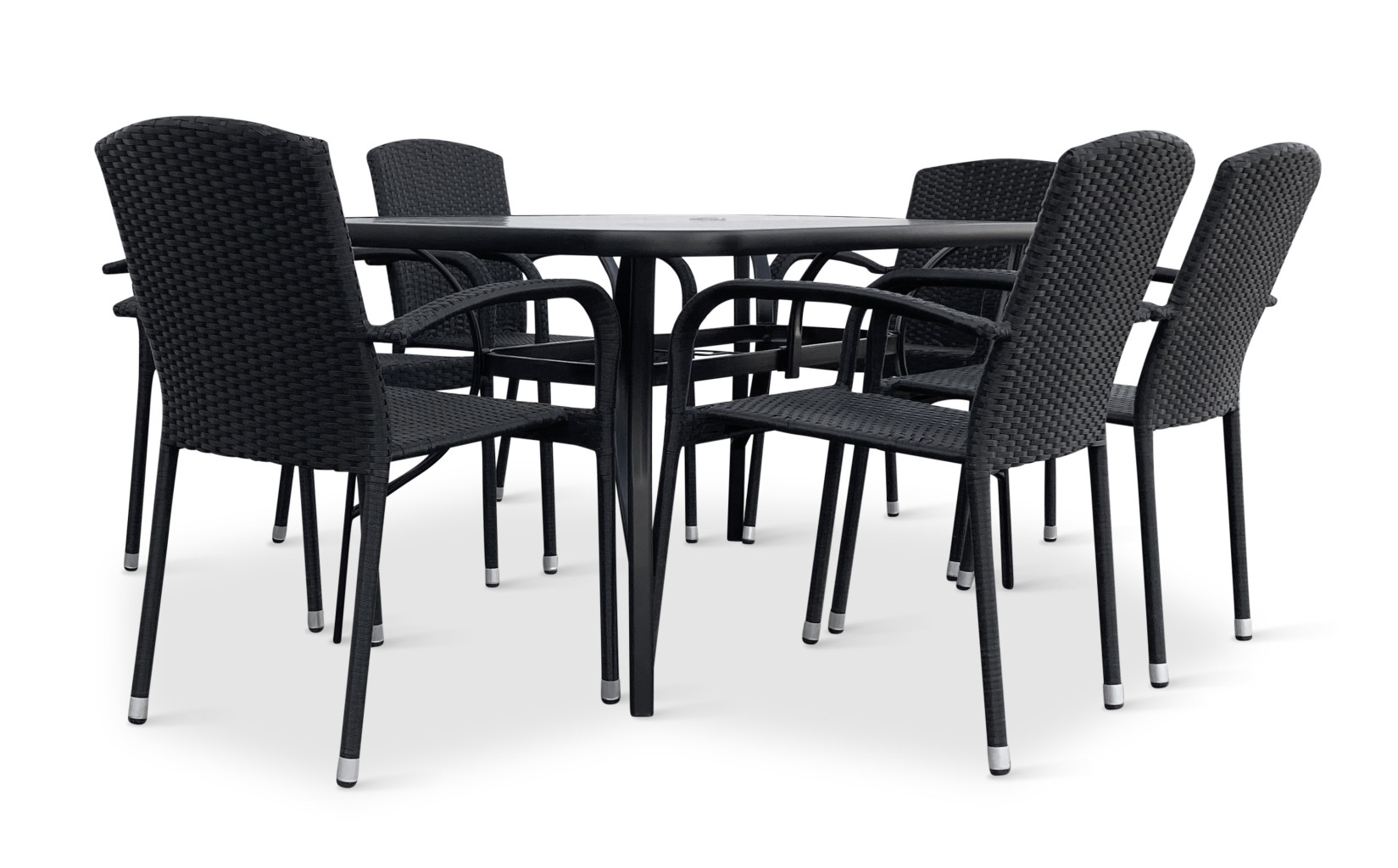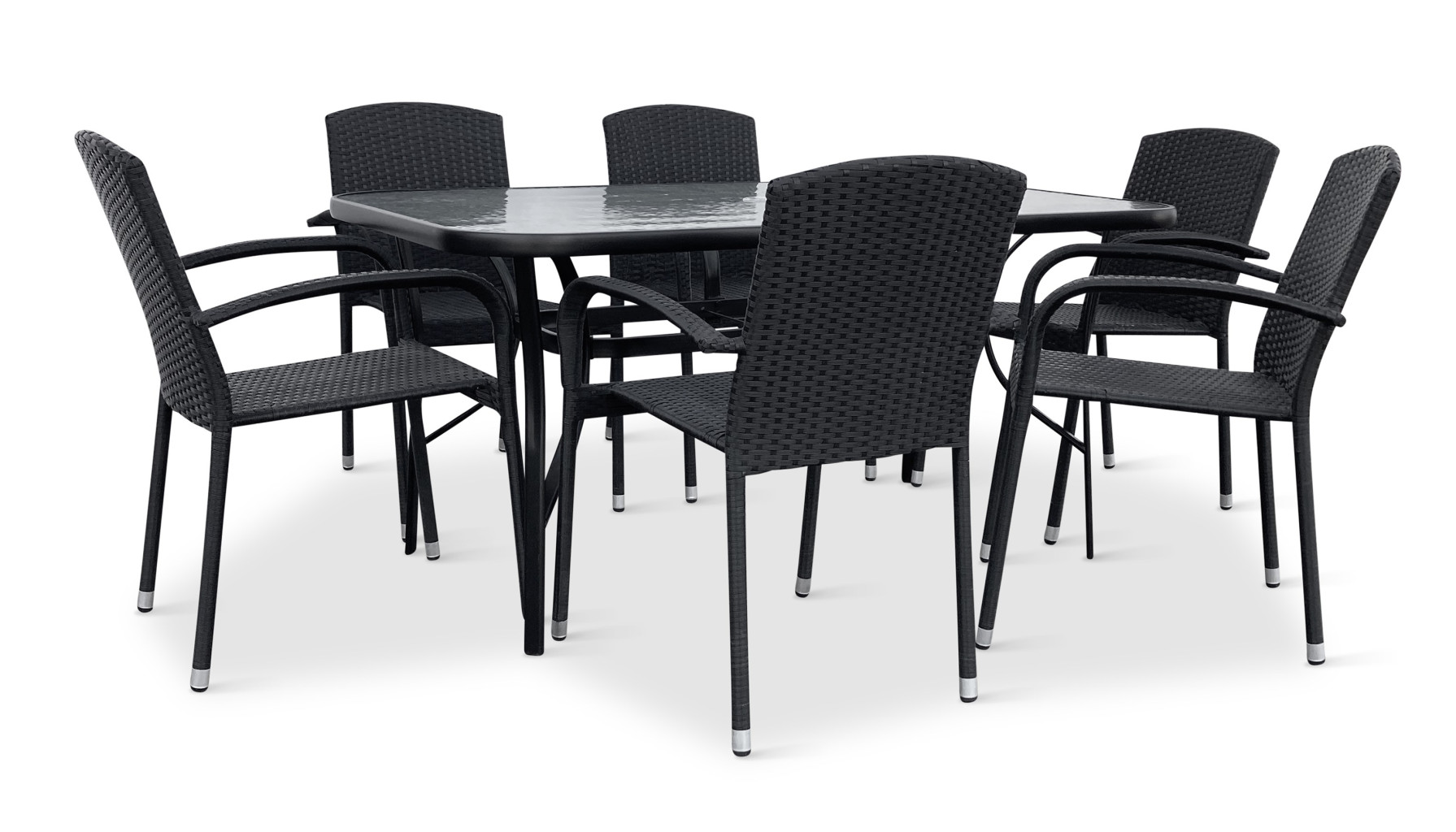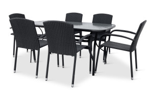 Jídelní stůl doplňují zahradní židle s ocelovou konstrukcí vypletenou umělým ratanem, které se hodí prakticky kamkoliv. Umělý ratan představuje velmi odolný materiál, který dobře snáší jakékoliv povětrnostní podmínky. Na slunci se nevyšisuje a po dlouhou dobu si uchovává svůj vzhled. Pro delší životnost byla ocelová konstrukce židle ošetřena proti rzi. Stohovatelné, téměř bezúdržbové židle s vyztuženým sedákem, který unese těžší váhy i po delší dobu.